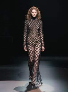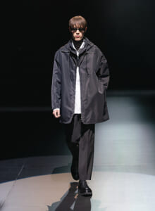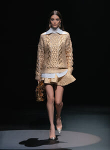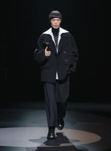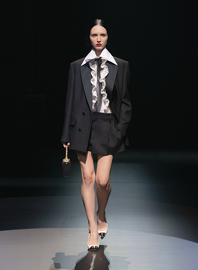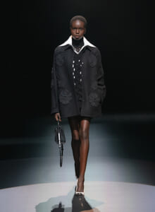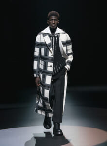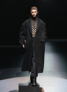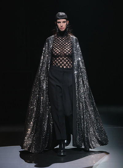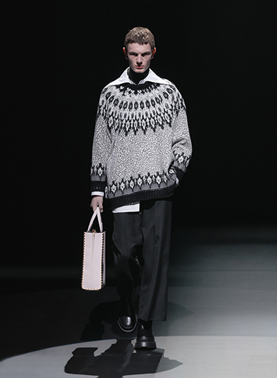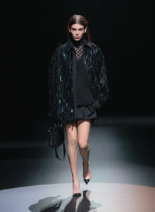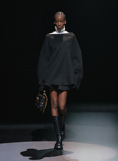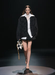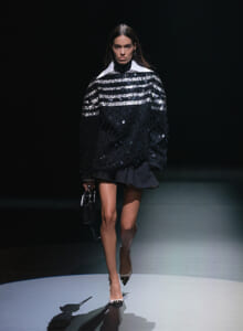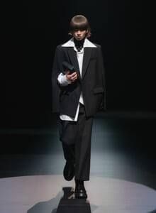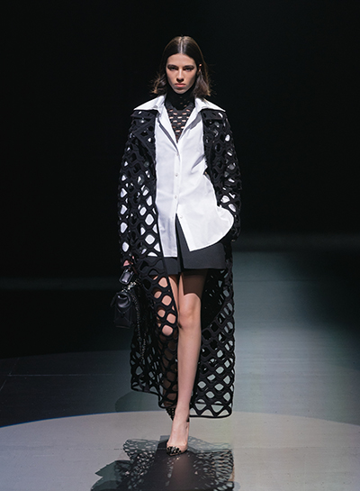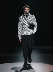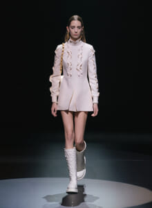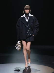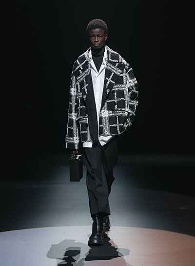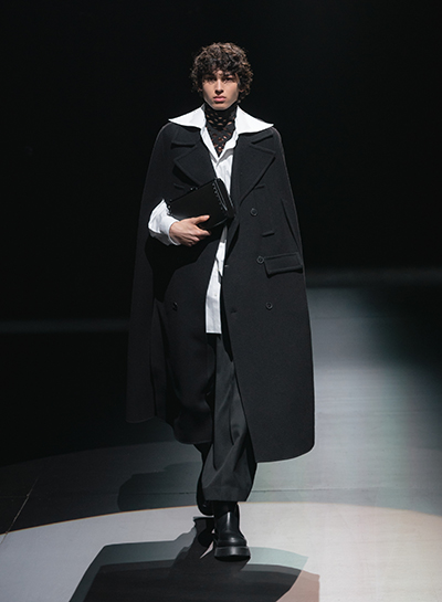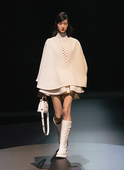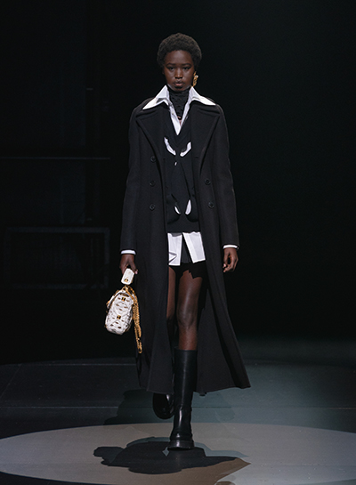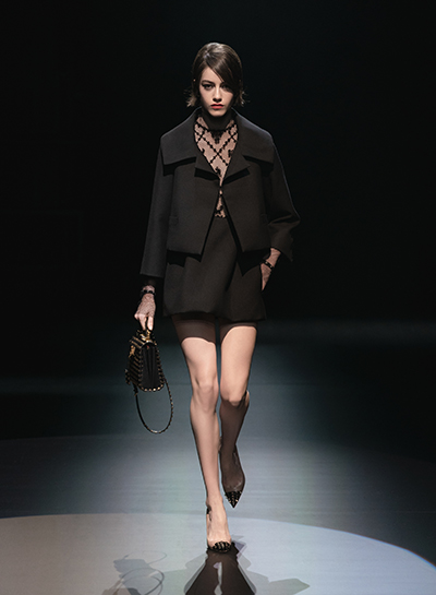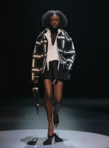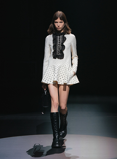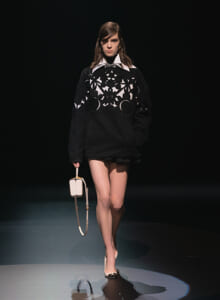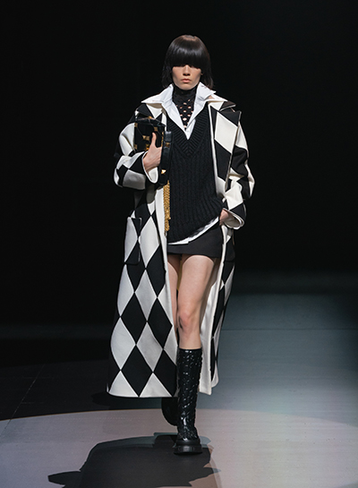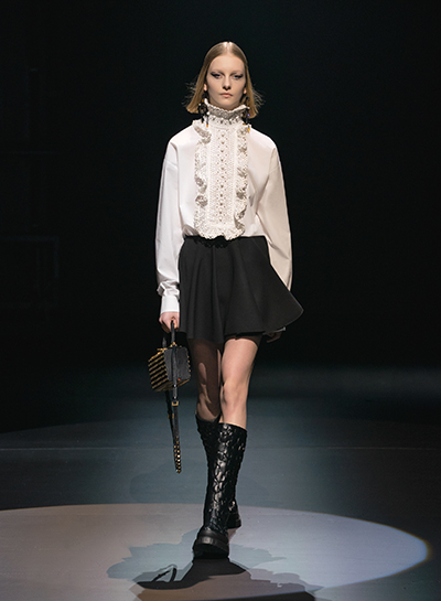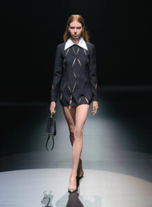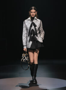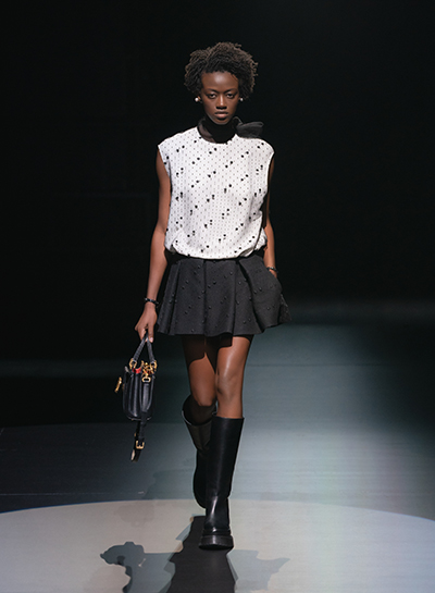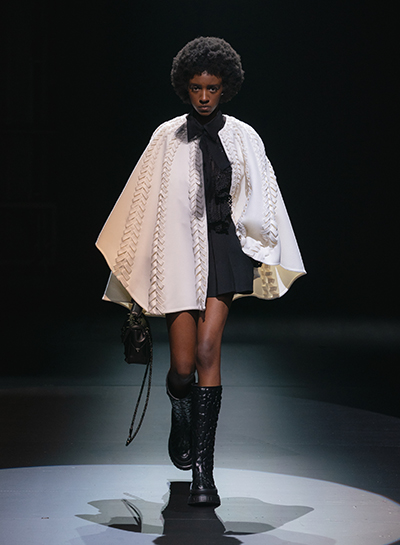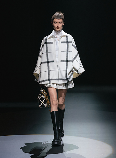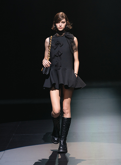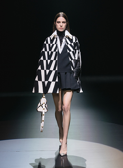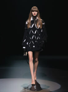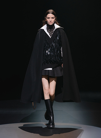 今シーズン、強い思いを胸にピエールパオロ・ピッチョ―リが表現したのは、黒と白で際立てた、ハサミで切り裂いたような新しいプロポーション。モデルの前髪は切り揃えられ、ドレスやスカートはスーパーショート丈に刷新。ジャケットやピーコートはシルエットをケープに変え、ひし形や‟V”のモチーフなど幾何学パターンで彩った。足元は、スタッズ付きのヌーディなハイヒールを合わせて官能的に。究極にシンプルな色と柄、そぎ落とされたシャープなシルエットでパンキッシュな強さを秘めた、新しいロマンティシズムを描いた。