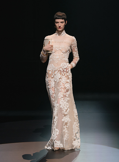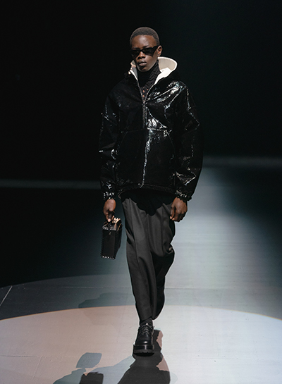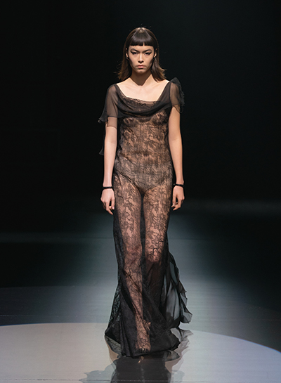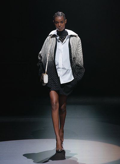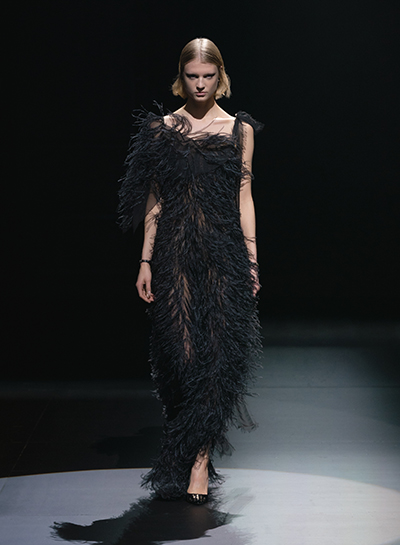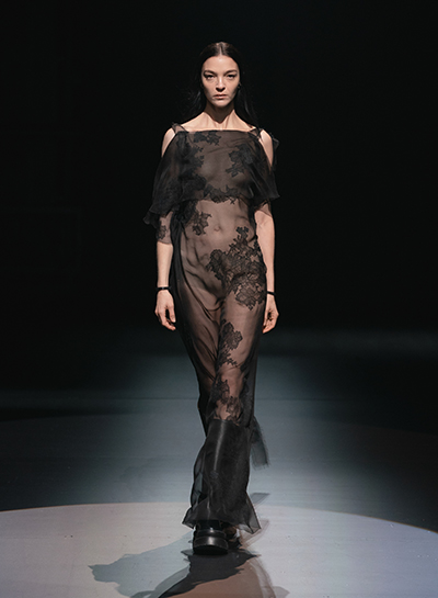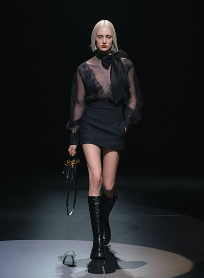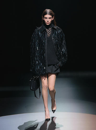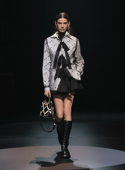 また、チェーンストラップやボディ全体にスタッズをデコレーションした新しい「ロックスタッズ」バッグや、クチュールの技術を注ぎ込んだ「アトリエ」シリーズからラバー素材のブーツが登場。花びらモチーフを立体的にデザインした一足は、緊張感のあるムードに甘いエッセンスをもたらした。