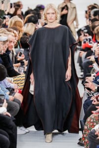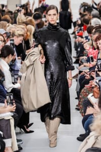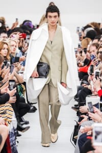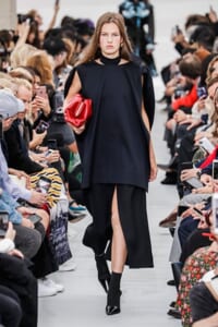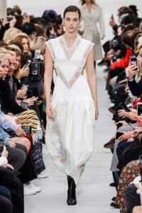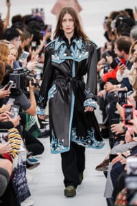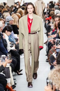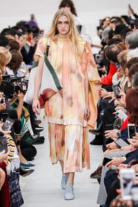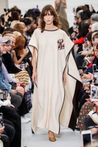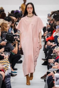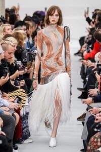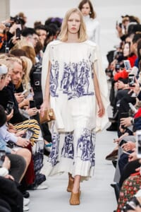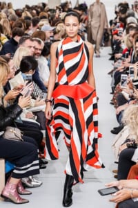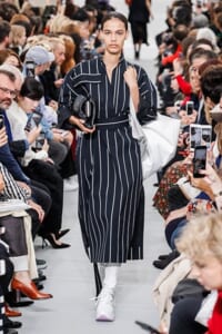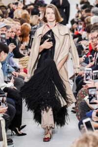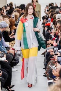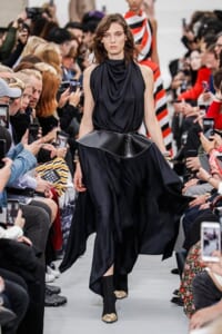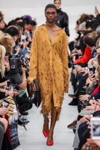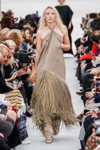 楽観的に自由を謳歌する、80年代初頭のパリのブルジョワレディがイメージ。メンズライクなパンツを再構築したホルタードレスは、裾で揺れるロングフリンジが、プリミティブな中に軽やかなエレガンスを醸し出す。テープ状に裁断したオーガンザ生地を1本ずつ木の棒に巻き付け、オーブンに入れて熱処理加工して形状記憶させたフリンジを手刺繍で施したデザインは、オートクチュール級のクラフツマンシップと斬新なアイデアの結晶。