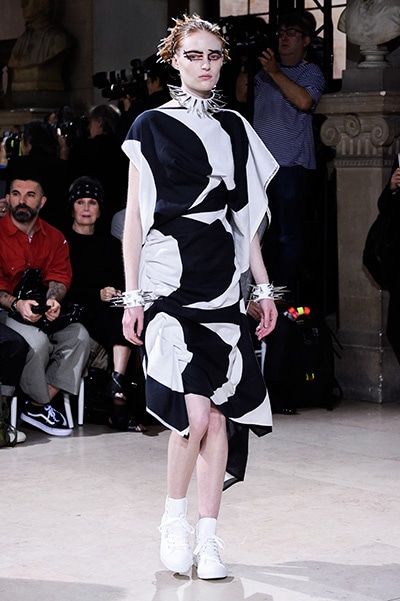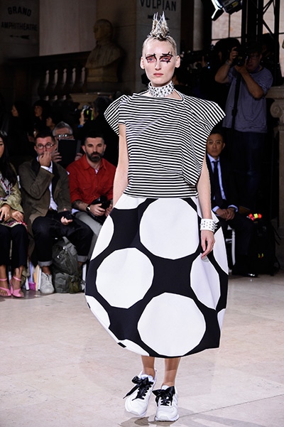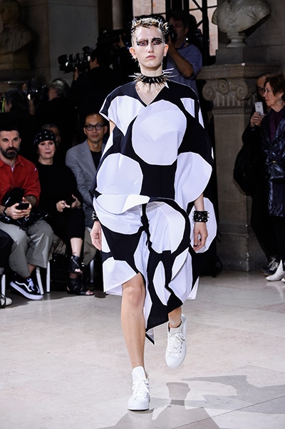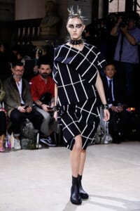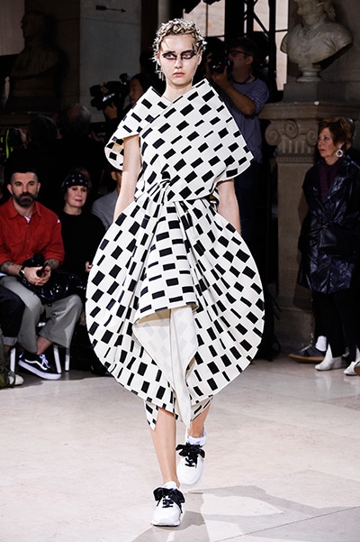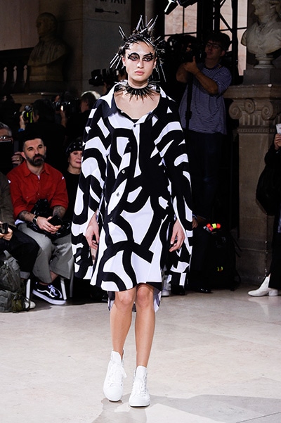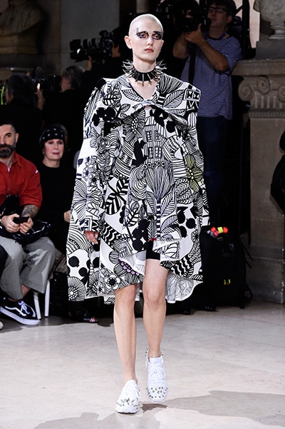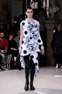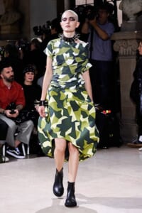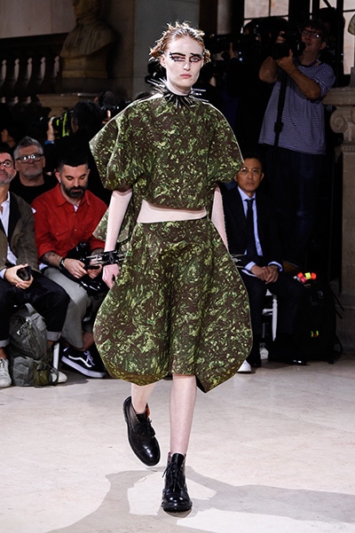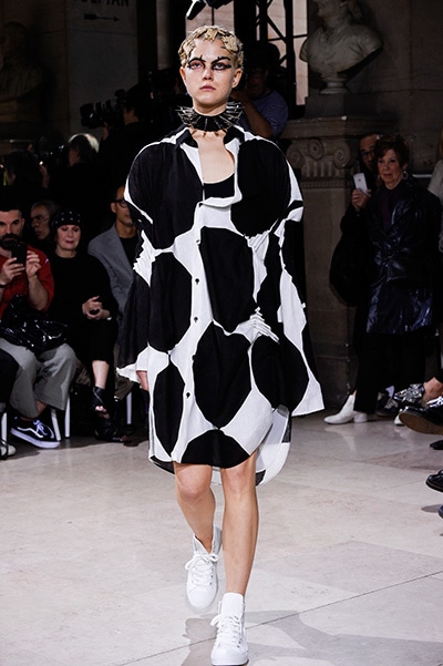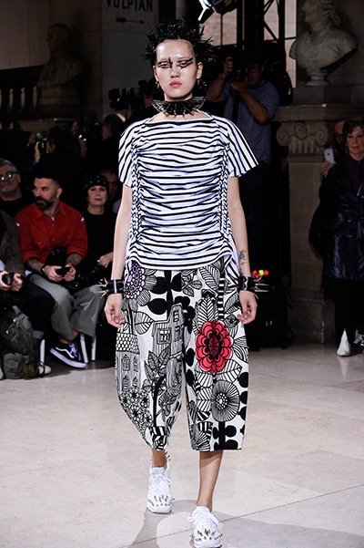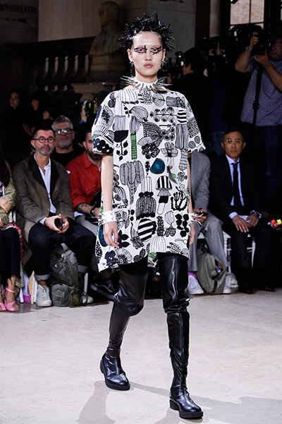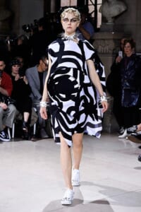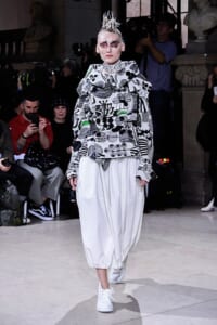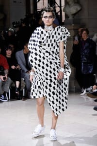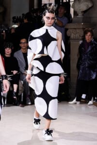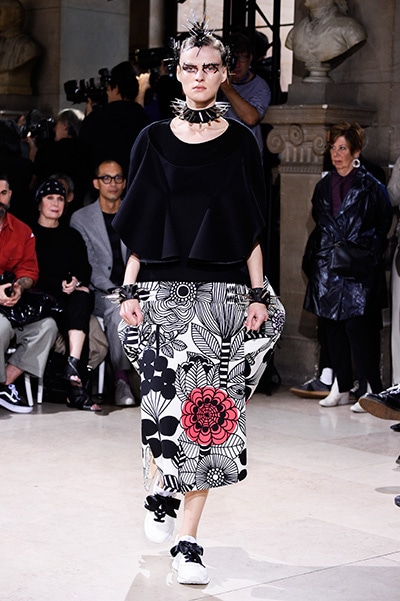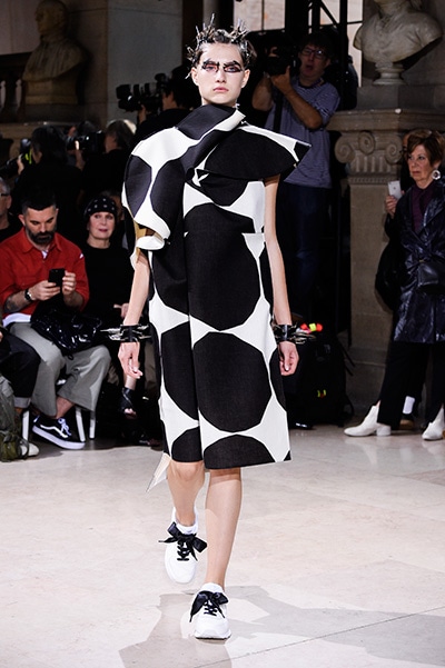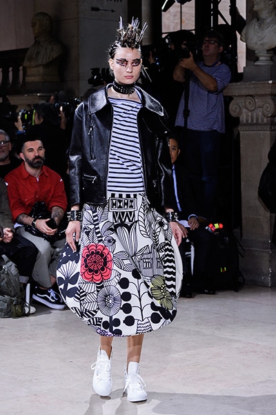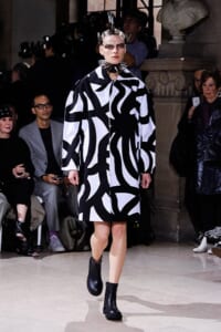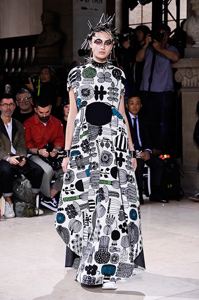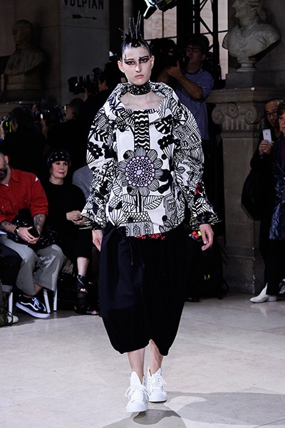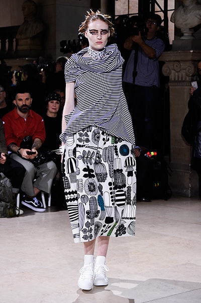 「自然のかたちをウエアに落とし込む」ことを追求したという今季は、自然の風景をグラフィカルに描く北欧の代表ブランド、あのマリメッコのテキスタイルを採用。大きなドットや大胆なモノトーンの抽象柄、個性豊かな草花や野菜といったマリメッコのインテリアファブリックを、複雑なパターンで遊ぶ3Dフォルムに仕立てた。ジュンヤらしいパンクマインドとポップなマリメッコのマリアージュに、自由なポジティブムードが漂う。