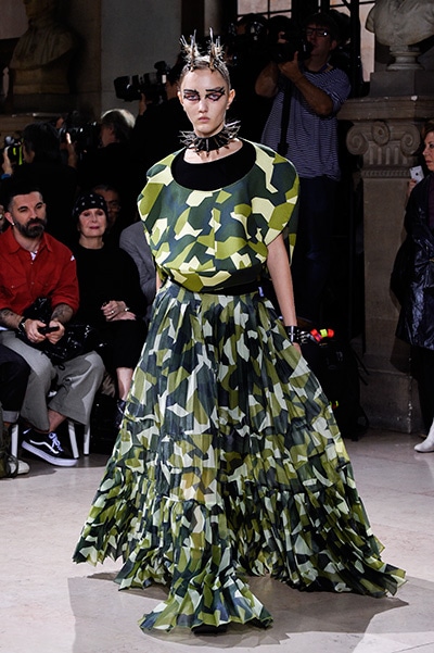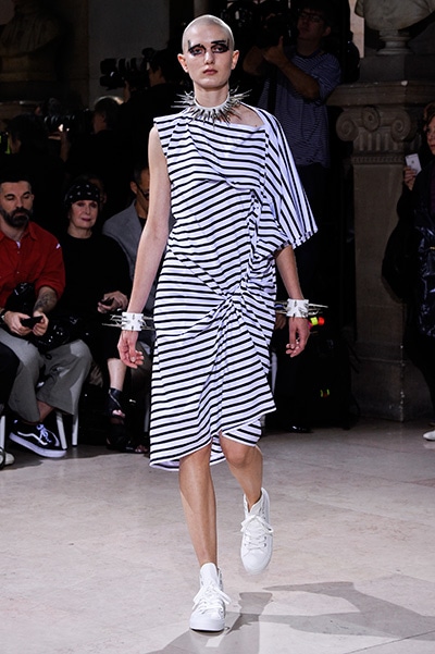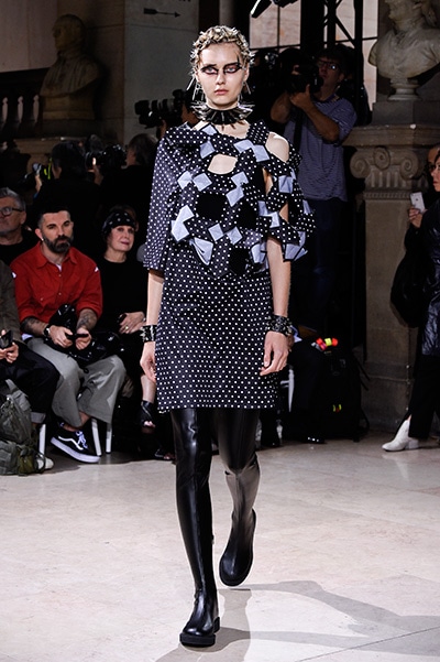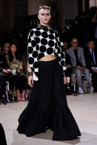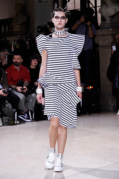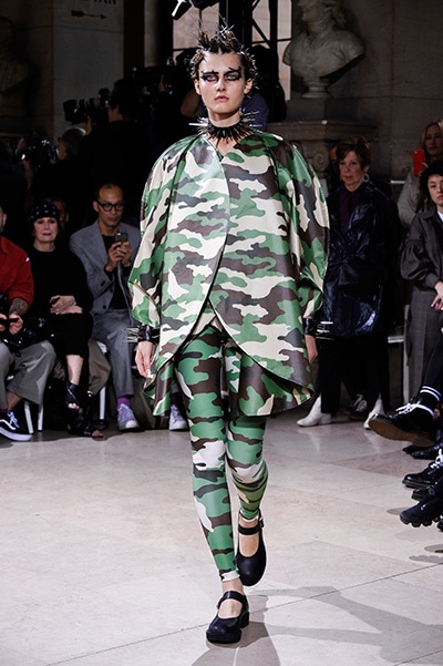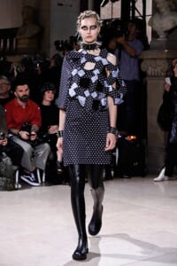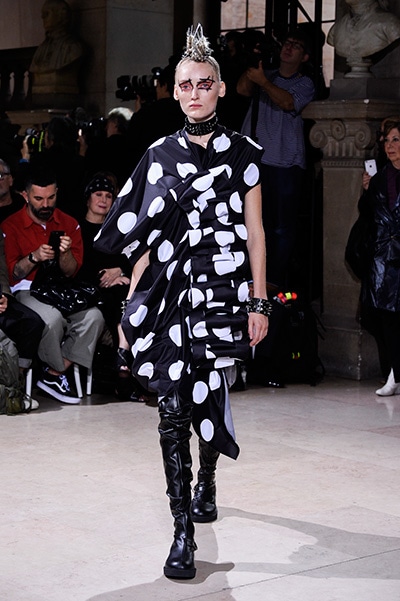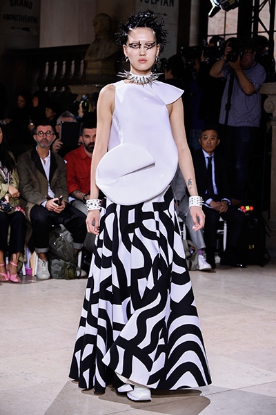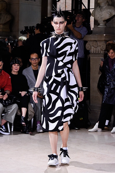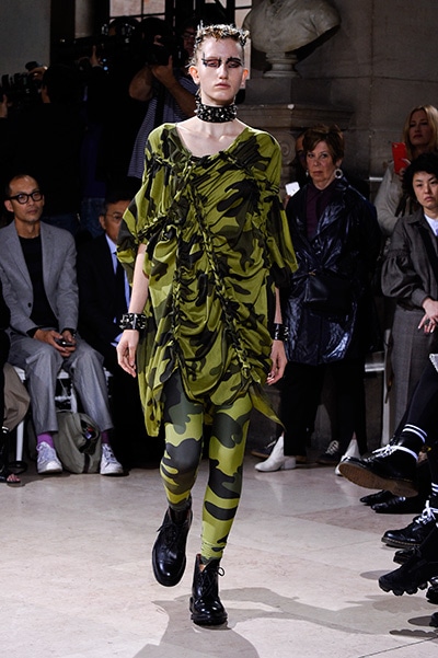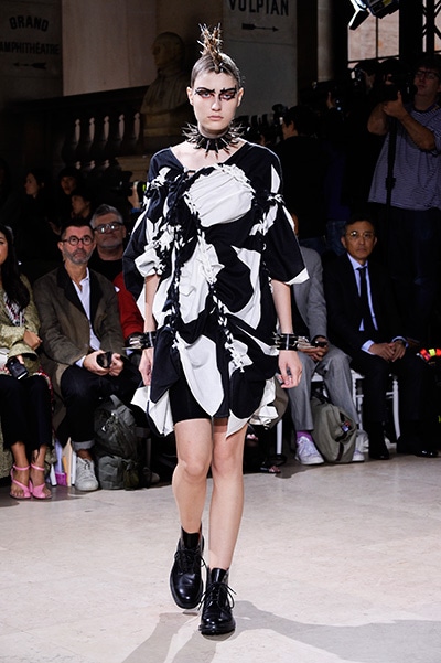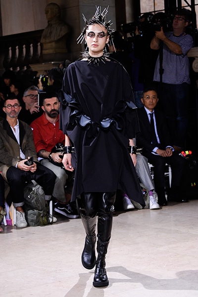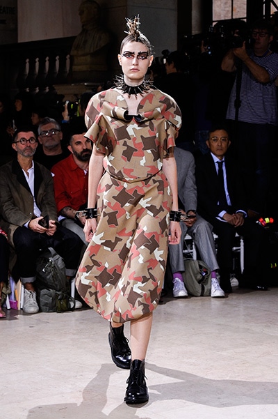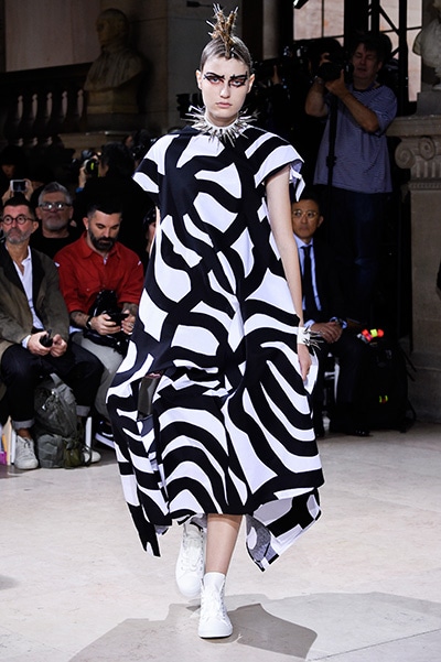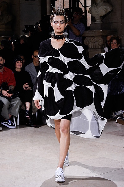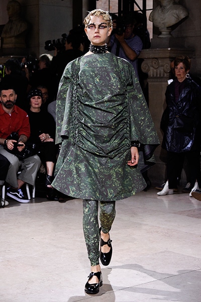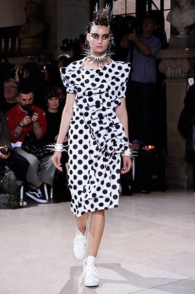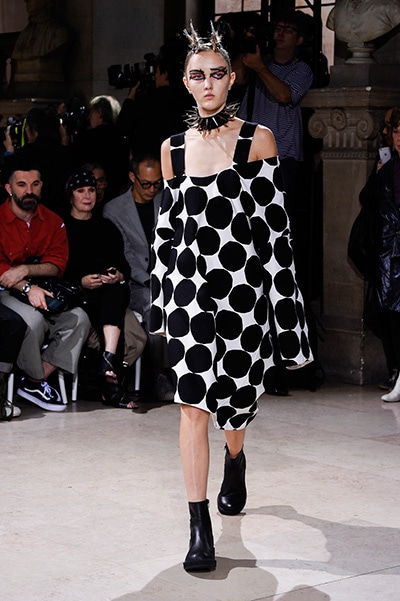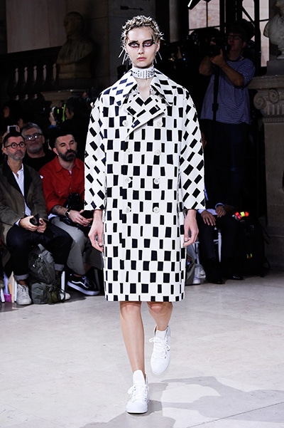 「自然のかたちをウエアに落とし込む」ことを追求したという今季は、自然の風景をグラフィカルに描く北欧の代表ブランド、あのマリメッコのテキスタイルを採用。大きなドットや大胆なモノトーンの抽象柄、個性豊かな草花や野菜といったマリメッコのインテリアファブリックを、複雑なパターンで遊ぶ3Dフォルムに仕立てた。ジュンヤらしいパンクマインドとポップなマリメッコのマリアージュに、自由なポジティブムードが漂う。
