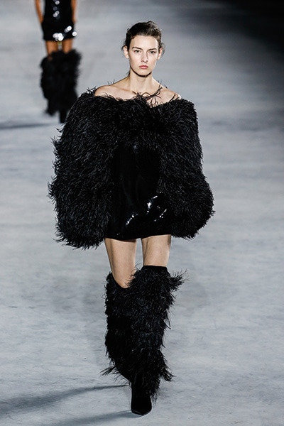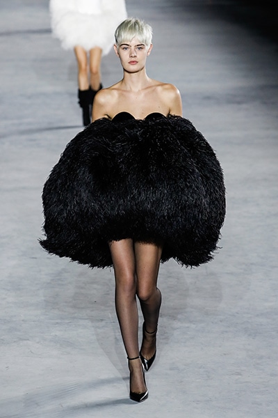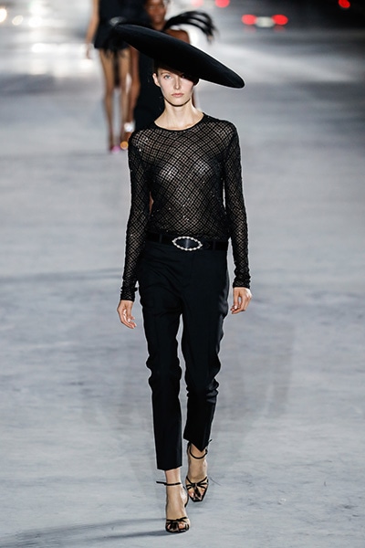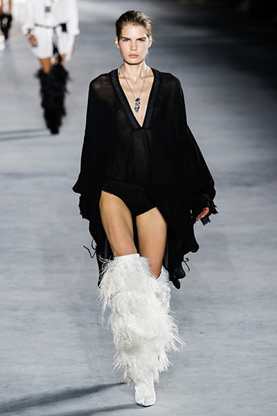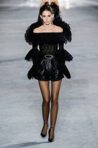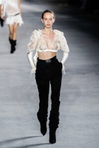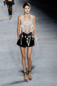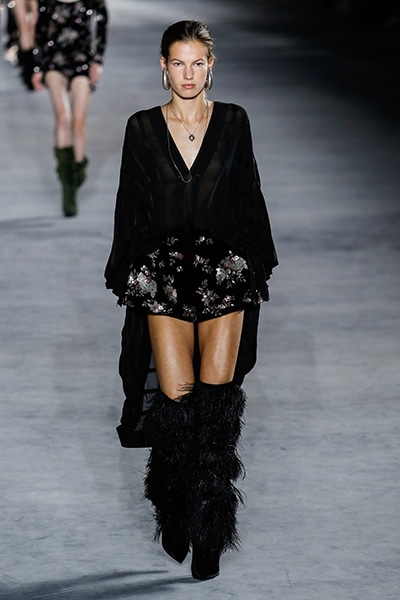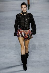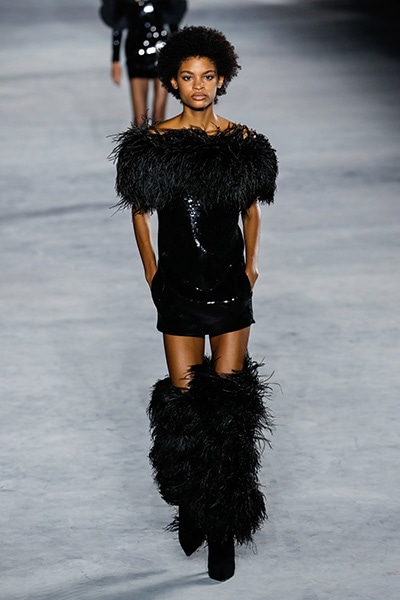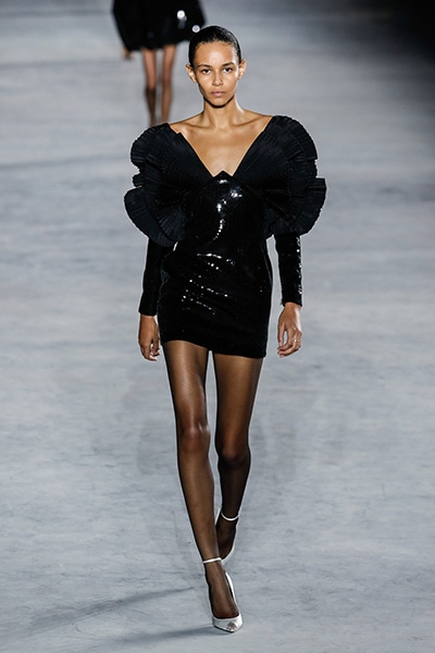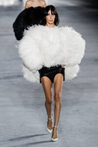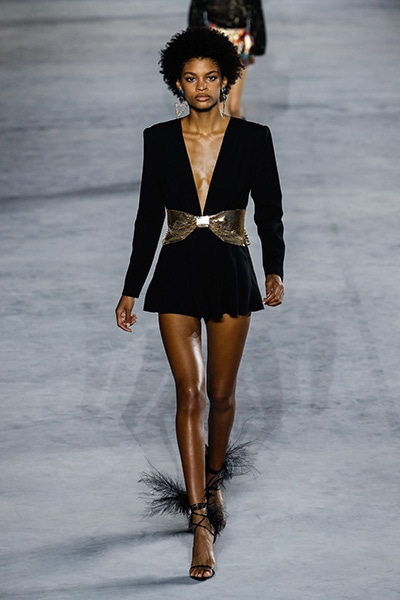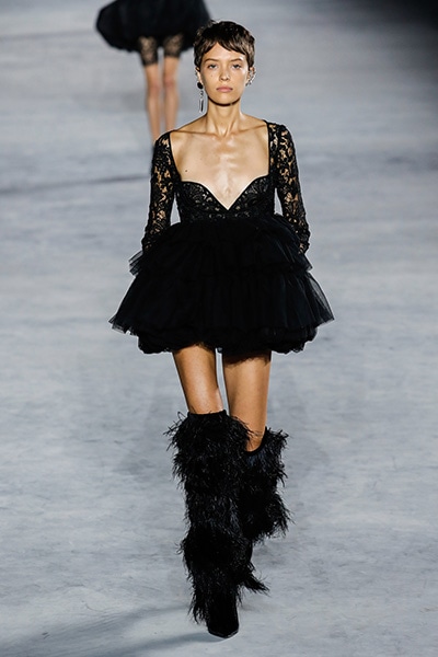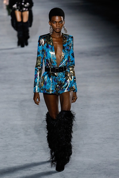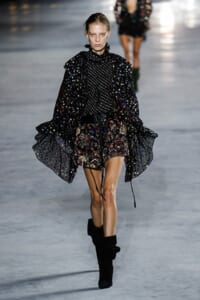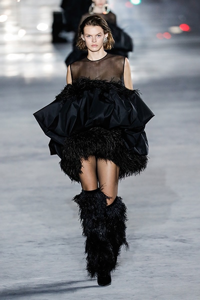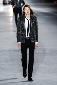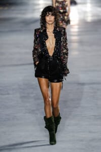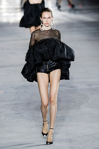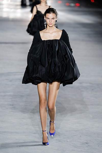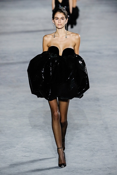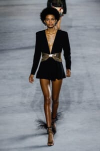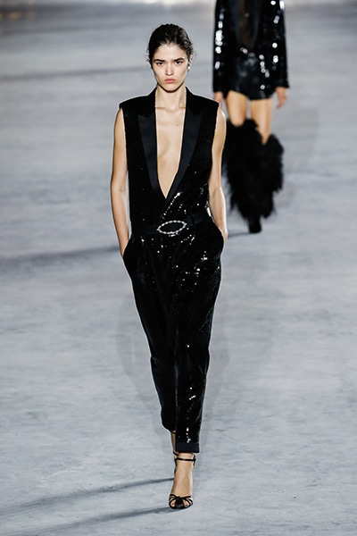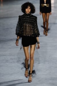 サンローランはトロカデロ広場でドラマティックなショーを開催。この3週間ほど前にイヴ・サンローランの長年のパートナー、ピエール・ベルジェが亡くなったばかり。ショーの始まりを告げるエッフェル塔の点滅が、彼に別れを告げているようだった。
