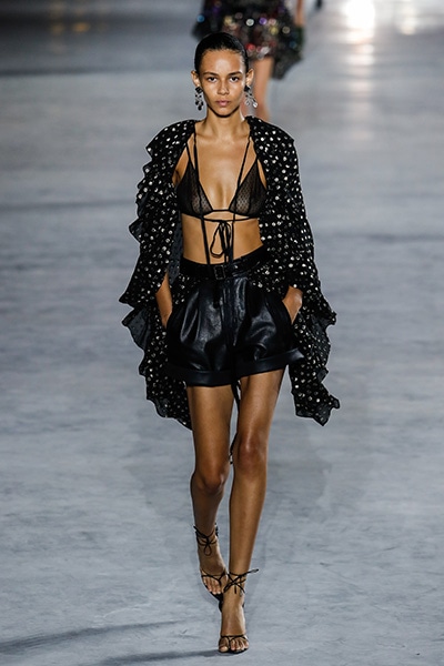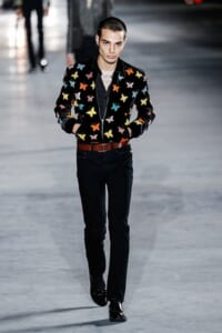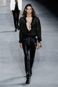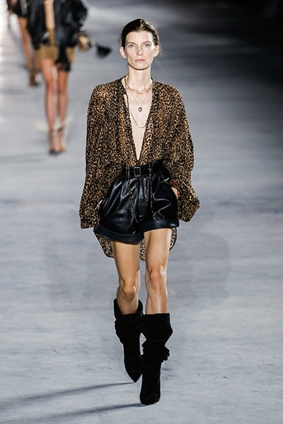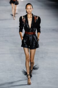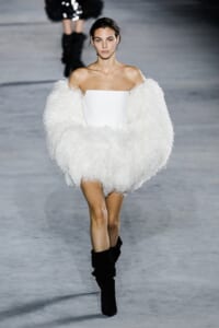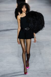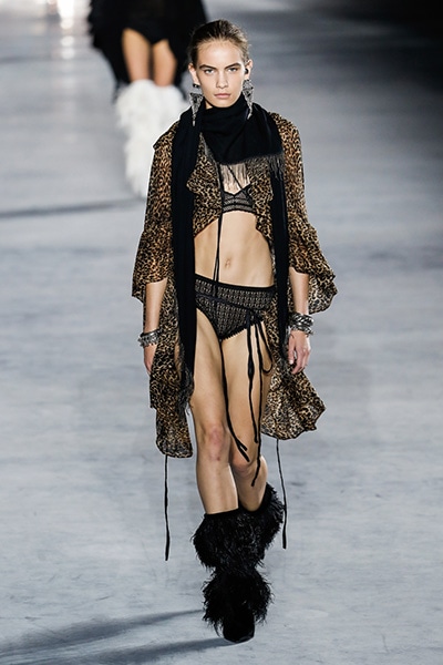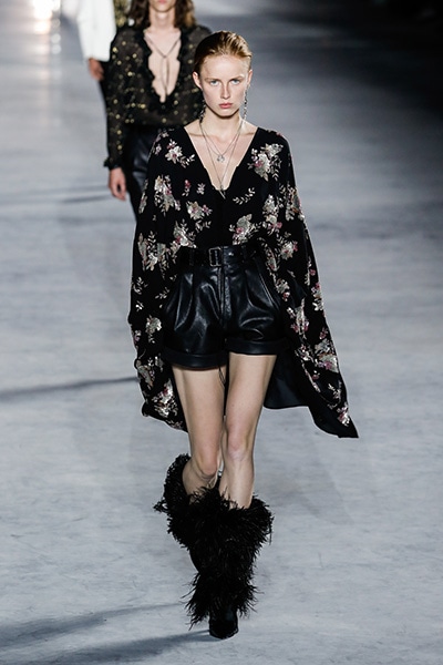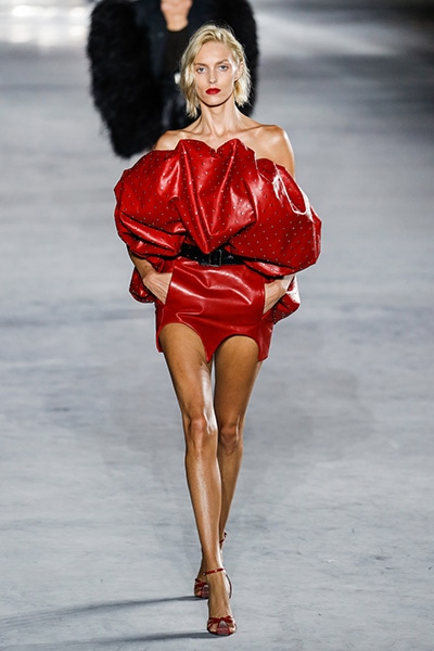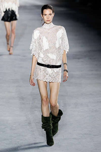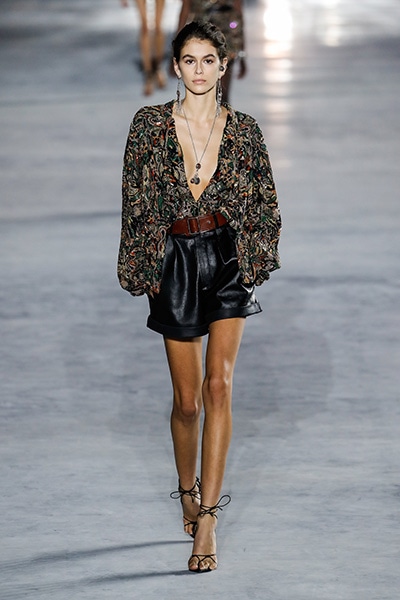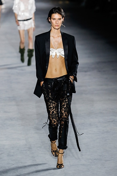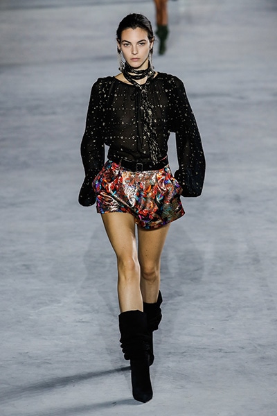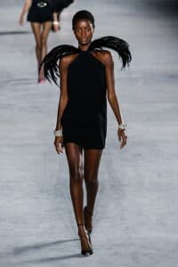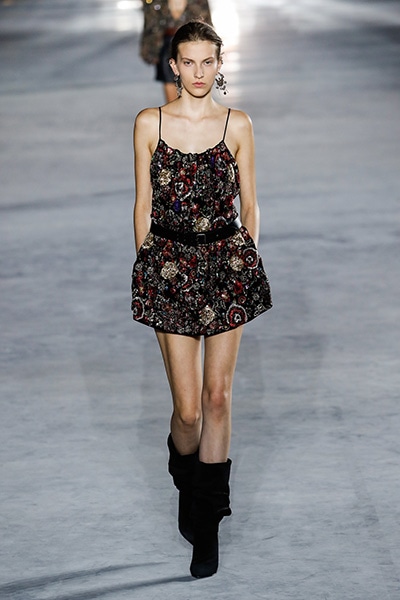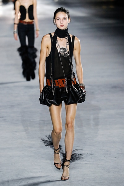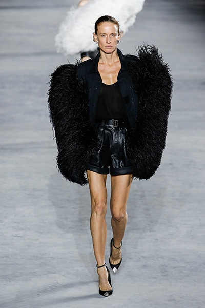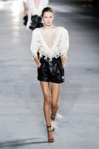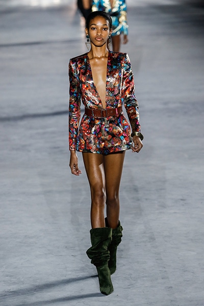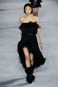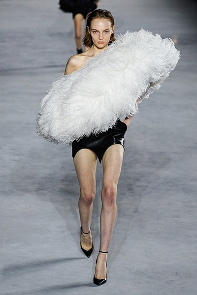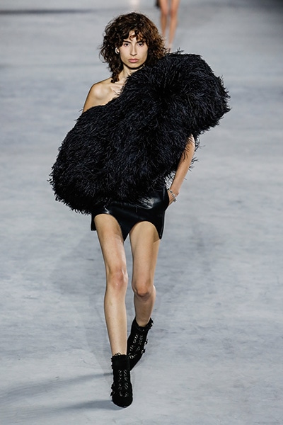 サンローランはトロカデロ広場でドラマティックなショーを開催。この3週間ほど前にイヴ・サンローランの長年のパートナー、ピエール・ベルジェが亡くなったばかり。ショーの始まりを告げるエッフェル塔の点滅が、彼に別れを告げているようだった。