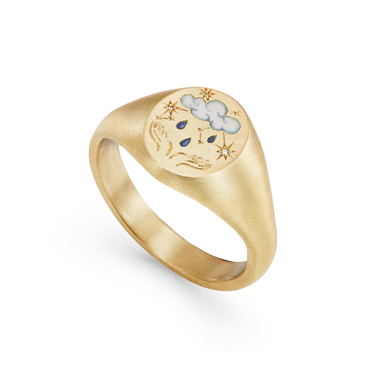 数多く所有するマリーエレーヌ ドゥ タイヤックのリング。最初に手にしたシトリン(左)。その後、誕生日に贈られたミニサイズのアメシスト、きちんとした装いにも合わせやすいカルセドニー、シリーズで発売した自著の黄色の表紙にちなんだレモンクォーツ、遊び心あるリップのリング。愛らしくユーモラスな存在感のシグネットリング(右)はシシ ジュエリーのもの。