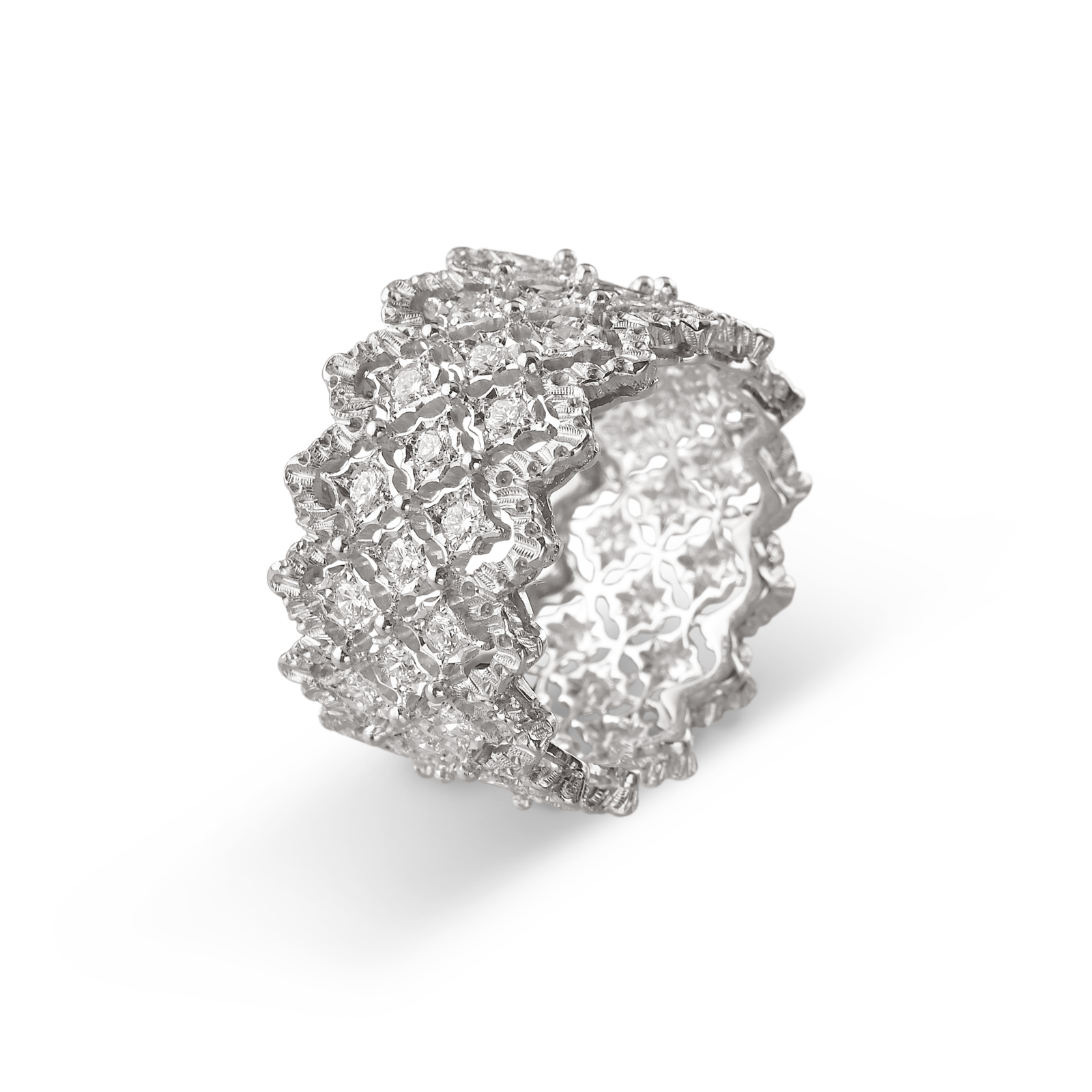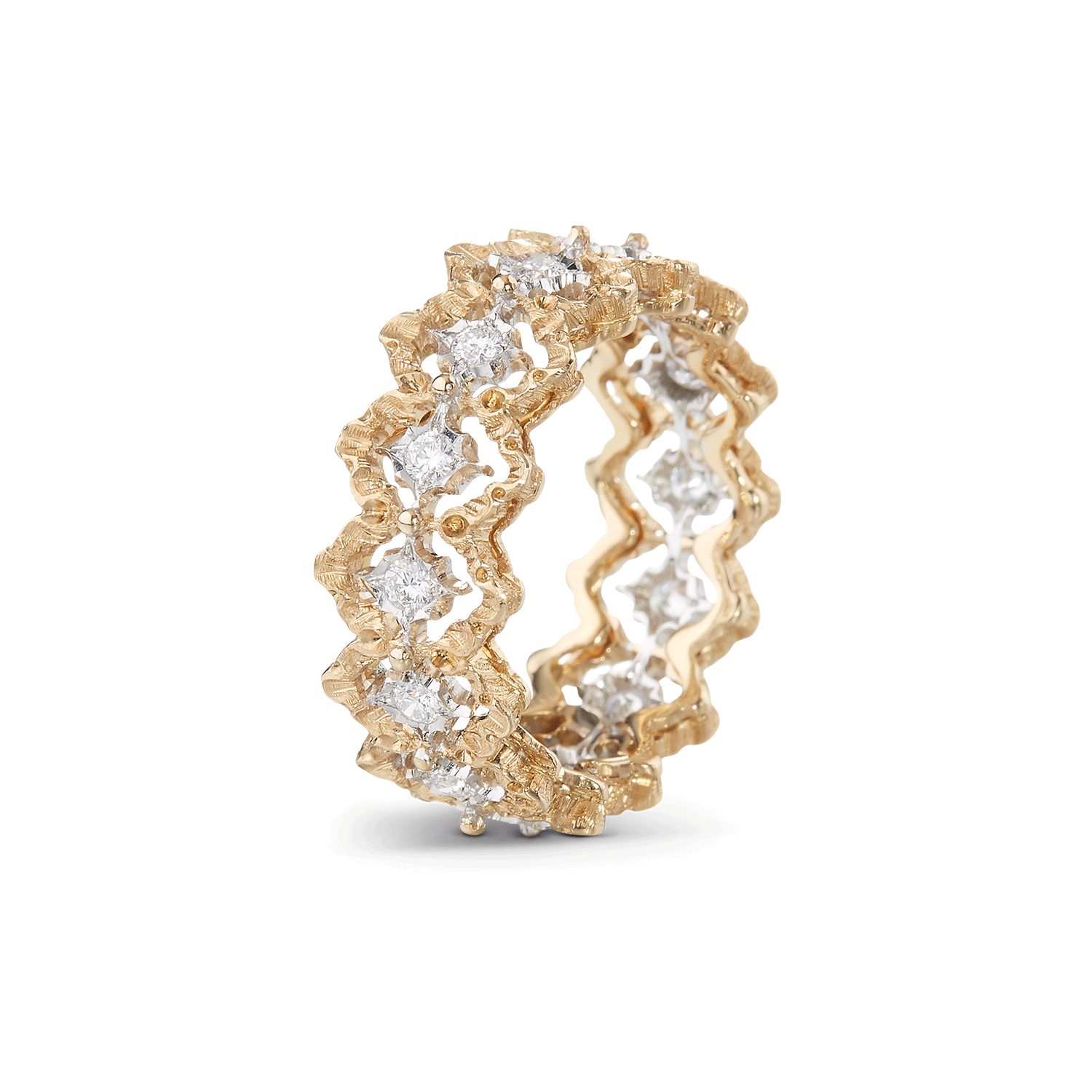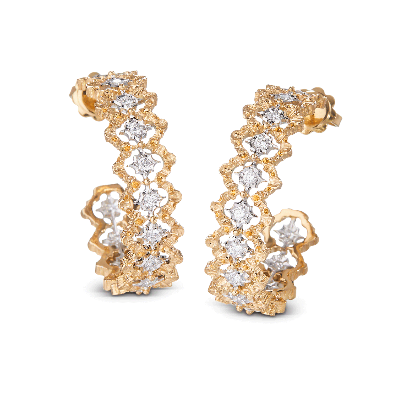 透けるように繊細な細工のジュエリーを重ねて、素肌を彩る。有機的な紋様の表面に星形のロゼットにはめ込んだダイヤモンドが輝くブチェラッティの「マクリ」コレクションと、緻密なイタリア伝統の職人技術を要する手仕事を駆使した切り抜き細工が生きる「ロンビ」コレクション。イエローゴールドとホワイトゴールド、そしてダイヤモンドの芸術的なオープンワークから覗く肌が、自然体の美しさを引き出す。