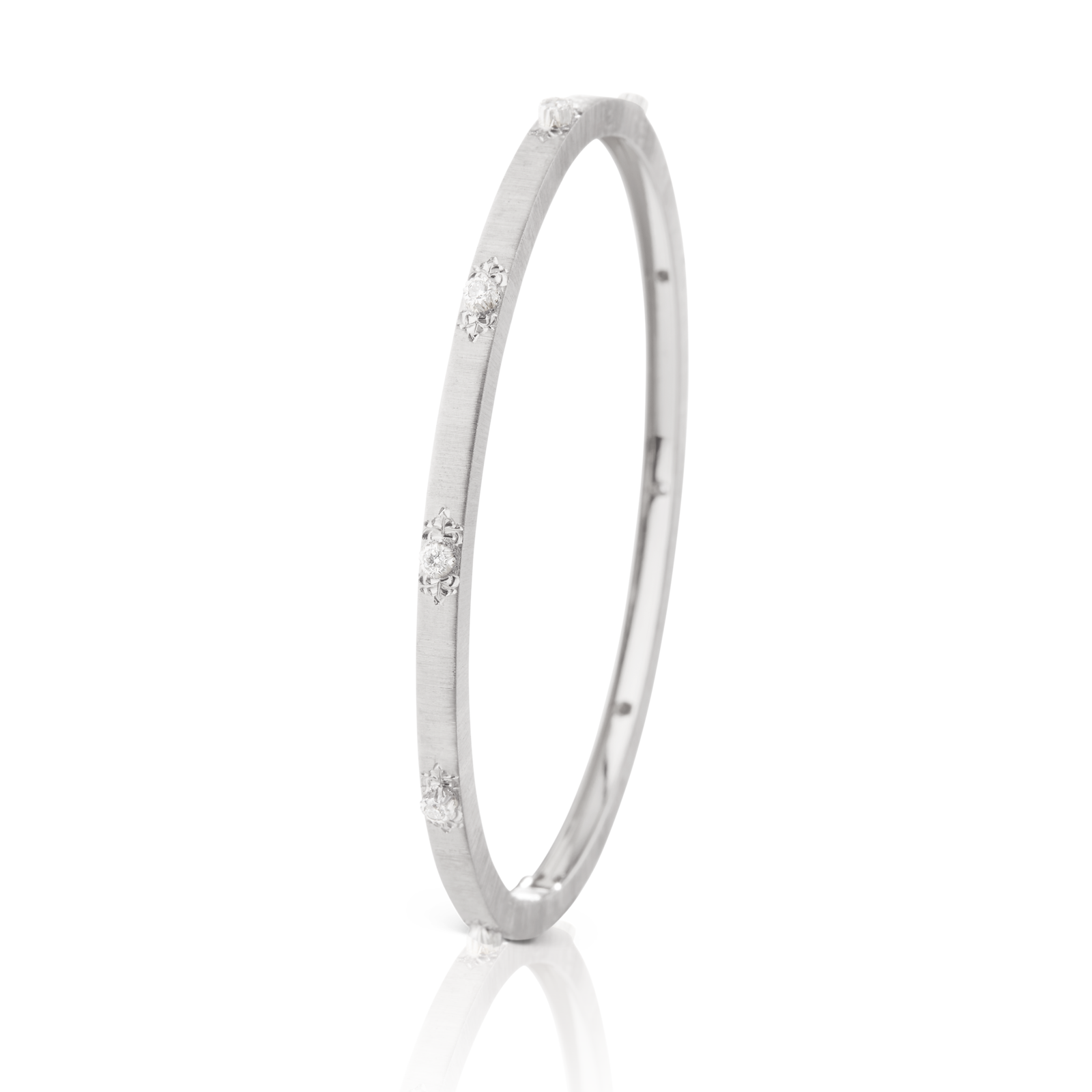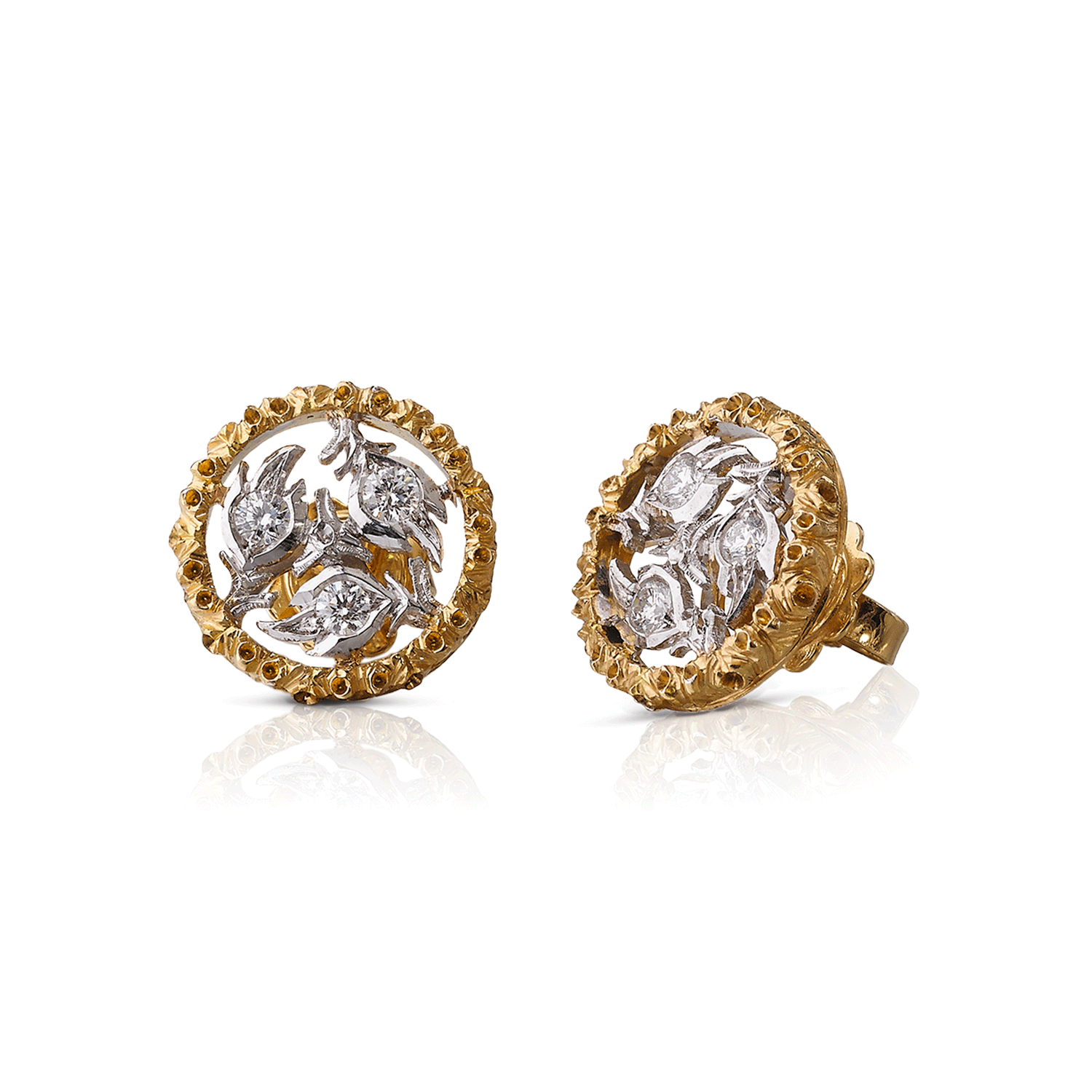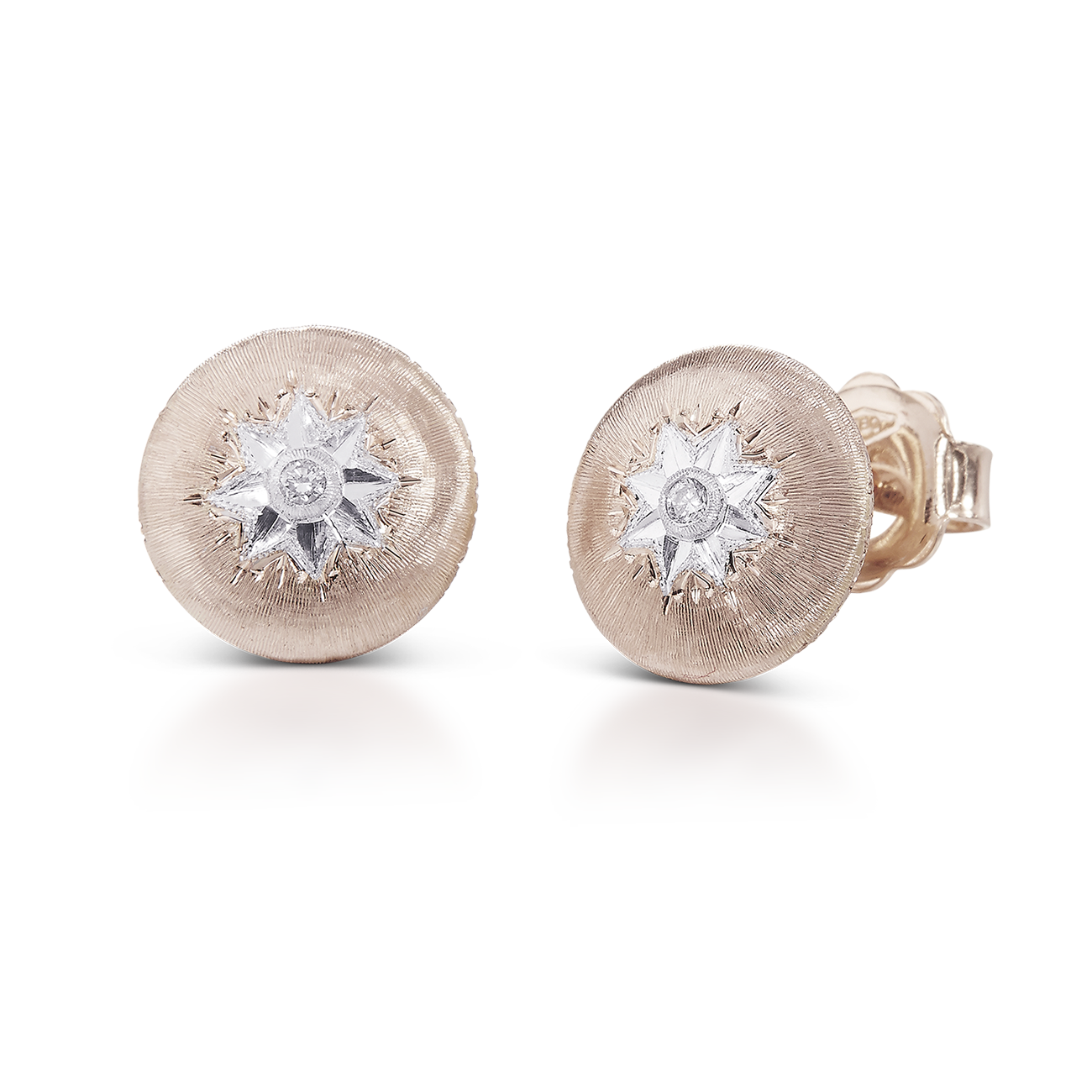 透けるように繊細な細工のジュエリーを重ねて、素肌を彩る。有機的な紋様の表面に星形のロゼットにはめ込んだダイヤモンドが輝くブチェラッティの「マクリ」コレクションと、緻密なイタリア伝統の職人技術を要する手仕事を駆使した切り抜き細工が生きる「ロンビ」コレクション。イエローゴールドとホワイトゴールド、そしてダイヤモンドの芸術的なオープンワークから覗く肌が、自然体の美しさを引き出す。