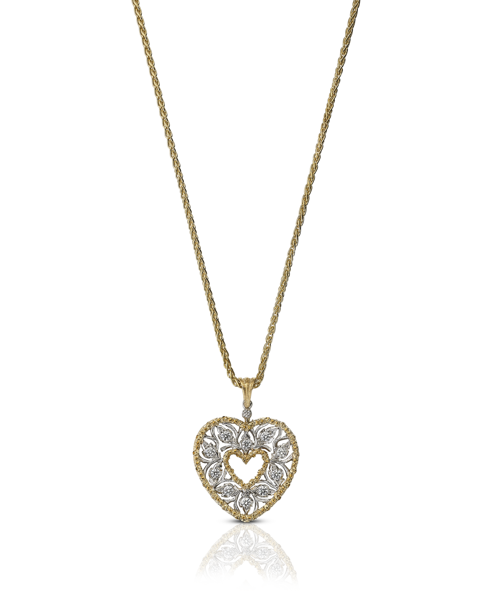 タフな装いには、レースのように繊細な彫金が煌めくハートの「ラマージュ」ペンダントを合わせて、内なるフェミニニティを呼び覚まして。ルネッサンス様式にインスピレーションを得た、精巧な枝葉のシルエットを活かしたデザインが、卓越したクラフトマンシップとメゾンの哲学を物語る。