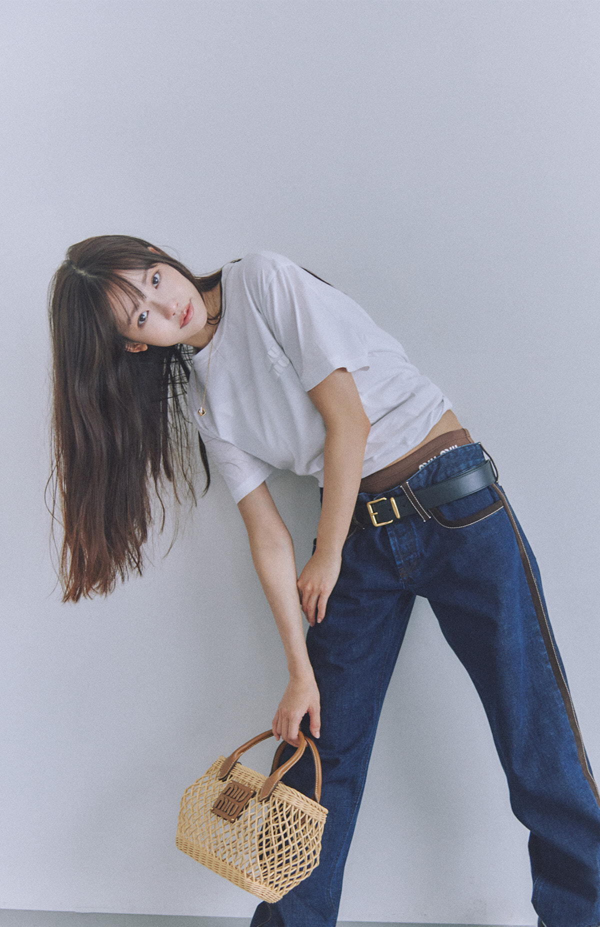 Tシャツとデニム、ベーシックなアイテムをノンシャランに纏うフレンチシックなスタイルは、ジェーン・バーキンの真骨頂。彼女にオマージュを捧げ、ミュウミュウのTシャツとデニムをコーディネートに選んだ。