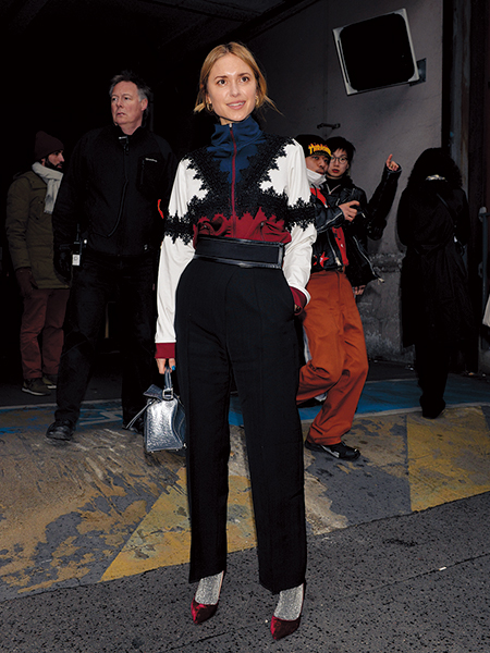 ペニーレ・タイスベックは、ガンニのトップを軸に黒やボルドー、シルバーを全身に配色し、グラフィカルに表現。