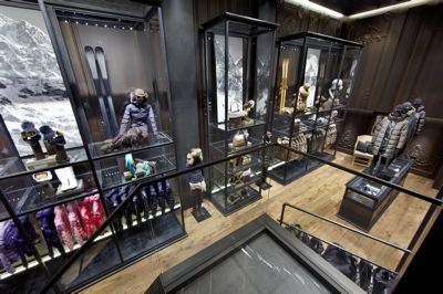 地下1階は、開放的な高い天井を生かし、雪山の写真を配するなど、モンクレールの世界観を感じられるディスプレイ。