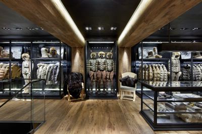 また、1階、2階部分は、古色加工した金物パネルやLondon Greyと呼ばれる大理石と、モダンなガラスのショーケースとのコントラストが印象的で、そこに置かれるウエアやアクセサリーを引き立てている。