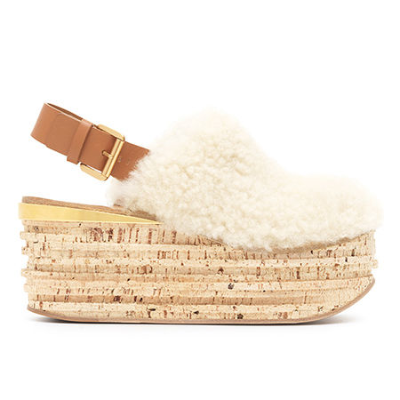 クロエより、ふわふわのムートンとコルクのウェッジソールのコンビが愛らしい「CAMILLE」。