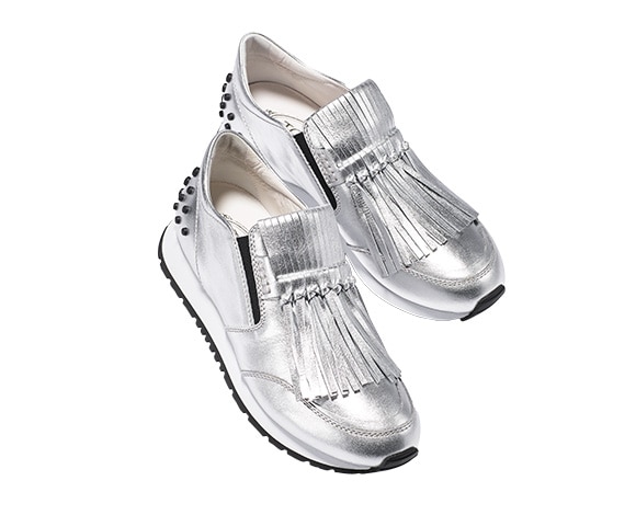 「春夏おしゃれを制する、スニーカー最旬ファイル。」より、トッズの「スポルティーボ」。トラッド調のデザインとメタリックな輝きのコントラストがいまの気分。