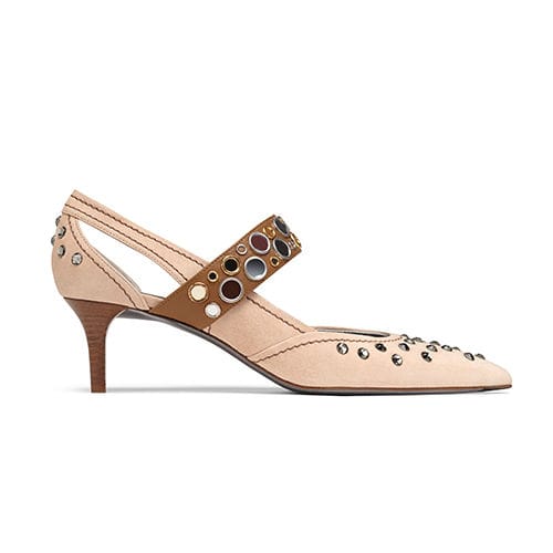 ボッテガ ヴェネタより、ヌードカラーにラインストーンやアイレットでアクセントをプラスしたシューズ。