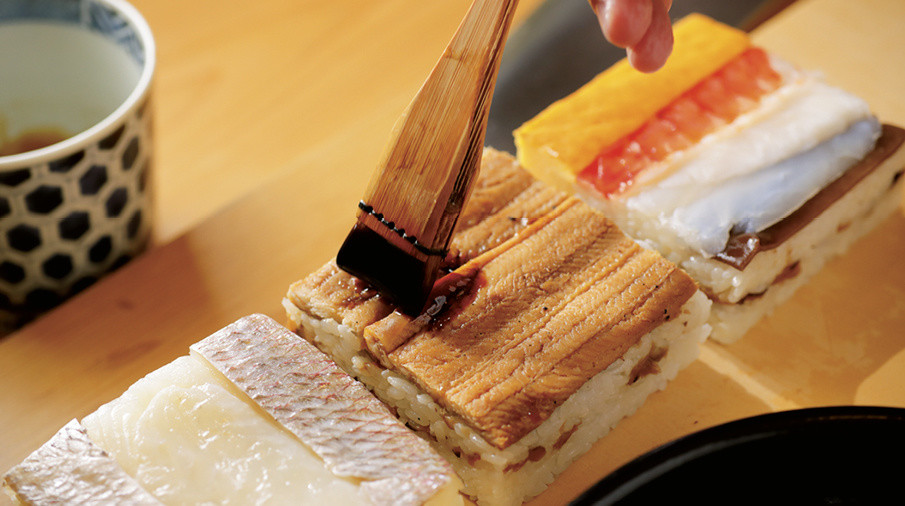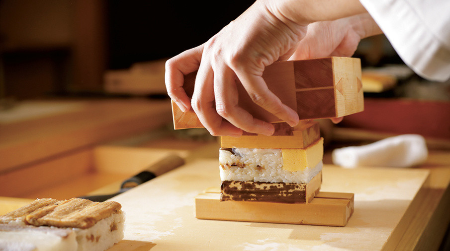 大阪鮨には、押し鮨、ちらし鮨、巻き鮨、蒸し鮨などがある。押し鮨はさらに、使う木型の大きさやかたちによって、箱鮨、棒鮨、小袖鮨などと分類される。ここでは、大阪鮨の代表的な存在である箱鮨を紹介しよう。