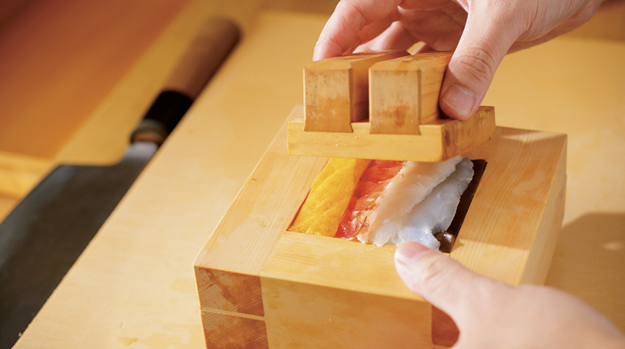 具材を詰めたら蓋をして、両手で手前を押し、90度ずつ回転させて四方で繰り返す。写真はコケラ鮨で、素材のグラデーションが美しい。