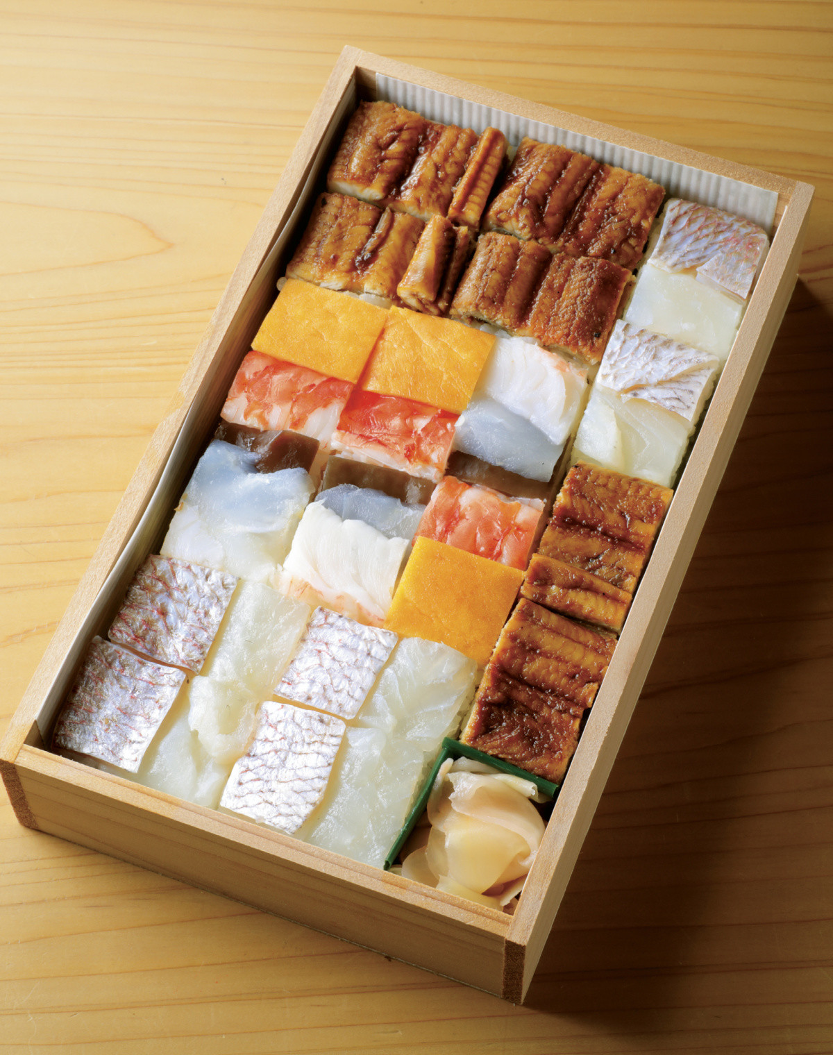 小鯛は皮のつなぎ目を自然に合わせたり、アナゴは鮨飯に沿うように鉄の重しをして焼き上げ、さらに木槌で叩くなど、細かな職人技が凝縮した伝統の箱鮨だ。