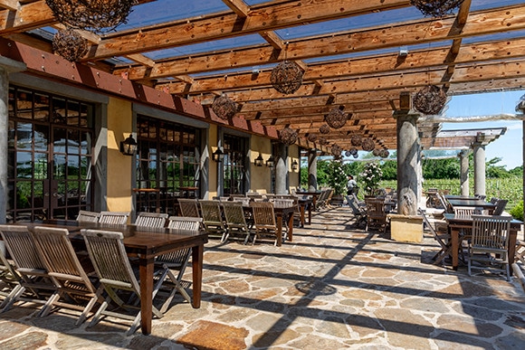 ワイン畑を眺めながらテイスティングを楽しめるデッキ。