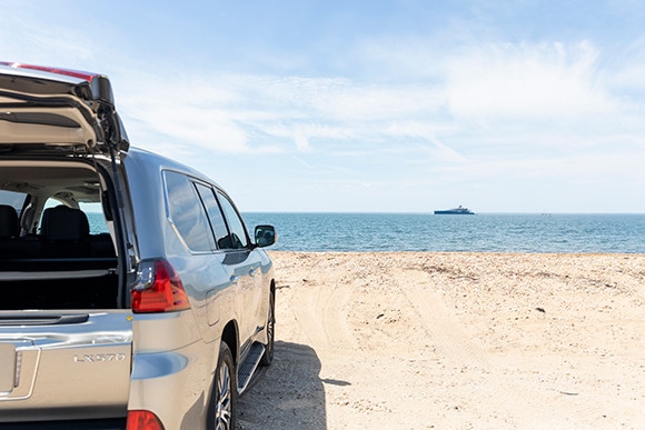 「ネイビービーチ」のあるモントークの海にて。「レクサスLX」はワンタッチでラゲージルームを広げることもでき、大荷物でも安心。ビーチを走ることもできる力強さも魅力だ。