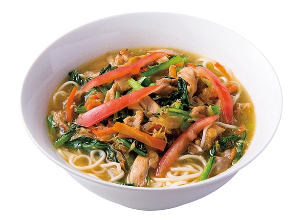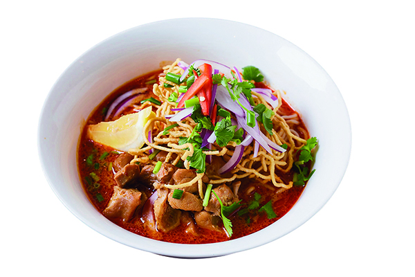 カレー風味のタイ風カオソーイ¥1,296。揚げ麺はカリカリ、茹で麺はもっちり。
