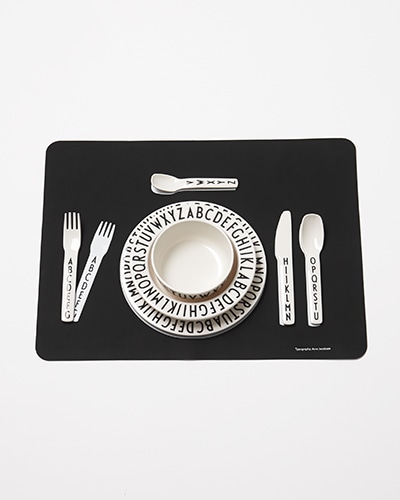 お食事セットを彩る美しいタイポグラフィーは、デンマークの有名な建築家アルネ・ヤコブセンが1937年に描いたもの。子ども自身も使いやすく設計された美しい形のカトラリーは、ヤコブセンの孫のトビアスがデザイン。慌ただしい食事時間も、デザインでスタイリッシュに。
