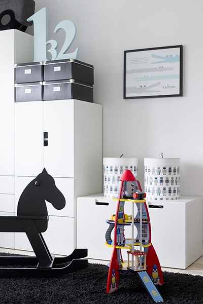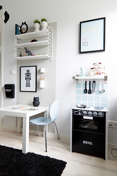 2歳のひとり息子の部屋には、ペールブルーをキーカラーに。部屋のペイントや、ミニキッチンのコーナーのタイル張りなどは自分たち自身でDIY。インテリアには、成長の早い子どもだから、コストパフォーマンスのいいイケアの家具を使いつつ、家具職人の父親が作った木馬やヴィンテージのミニキッチンも、黒と白にペイントし直してから設置。