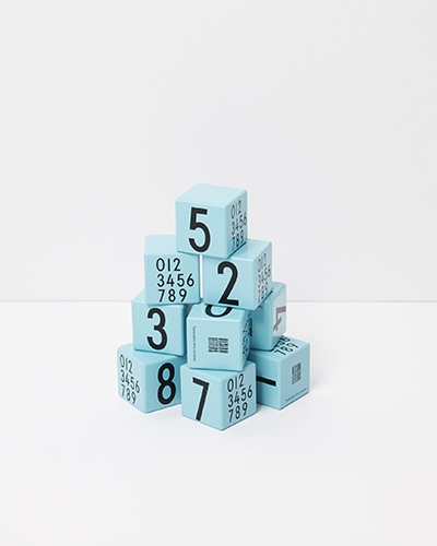 鮮やかなブルーが印象的な木製の積み木は、美しい数字が特長。この文字は、デンマークを代表する建築家、アルネ・ヤコブセンが生み出したタイポグラフィー。子ども部屋がデザイン度アップすること間違いなし。