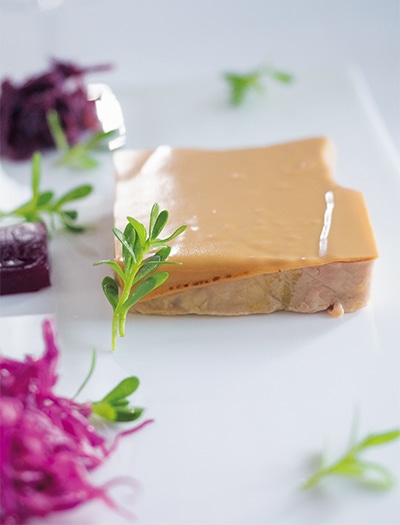 料理はすべて4,299,000ドンのコースより。フォアグラのテリーヌの表面をキャラメル風味のチョコレートでコーティング。アーティチョーク、赤キャベツのサラダを添えた「Foie Gras」。