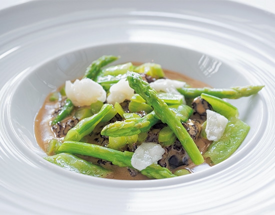 ベトナムコーヒー風味のクリームソースを合わせたアミガサタケ。クリーミーだがほろ苦く香ばしい。ダラット産のアスパラガスと南国のフルーツ、サワーソップとの組み合わせが爽やかな「Fresh Turkish Morels」。