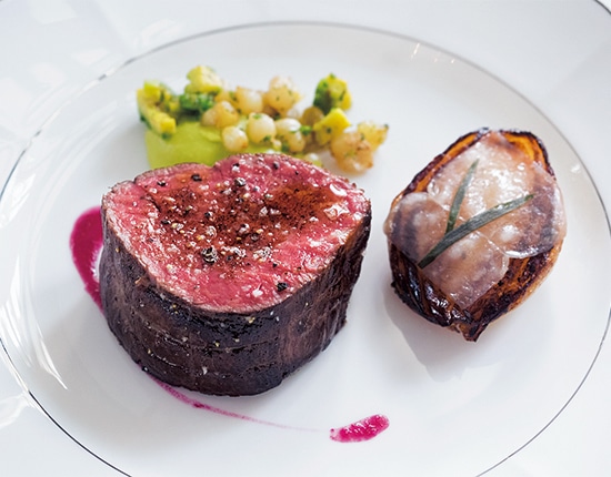 赤身肉のローストは脂が少なくヘルシー。旨味を閉じ込めるために、大きな肉塊の状態でローストし、カットされる「Wagyu Beef Fillet」。赤キャベツのソースは見た目にも美し く、肉をさっぱり食べられる。オーブンでじっくり焼いたタマネギは甘くて美味。