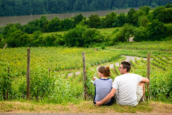 ブドウ畑を眺めながらワインを楽しむカップル。生活のなかにワインが溶け込んでいる。