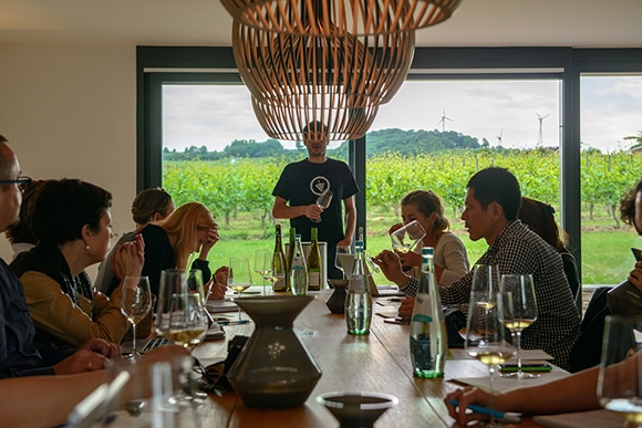 リースリングのゼクト(スパークリングワイン)でわれわれを迎えてくれたのはシュテファン・ヴィンターさん。ゼクトは酸がきれいでリフレッシング。泡も味わいも繊細で柔らか、いつまでも飲んでいたいと思わせるワインでした。シュテファンさんは36歳。「ジェネレーション・リースリング」のメンバーでしたが、同会は35歳になると“卒業”しなければならない決まりなので、現在はOBということになります。代々ブドウ栽培をしてきたヴィンター家ですが、自分たちで造ったワインをボトル詰めして売るようになったのはシュテファンさんの祖父の代から。