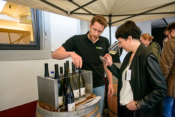 顔の半分を覆う濃いヒゲがアーティストっぽいゲオルク・フッサーさん。彼の造るワインはどれもワイン本来の色合いを超えた、目に見えない色を放っているように感じられます。本人にそう言うと、「それはビオディナミ(思想家ルドルフ・シュタイナーの理念に従った有機農法)を実践しているからじゃないかな」とのこと。シュペート・ブルグンダー(ピノノワール)はいつまでも飲んでいたいと思わせる上品で伸びやかな味わいでした。