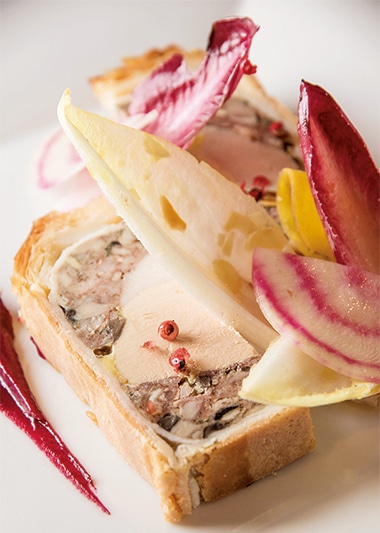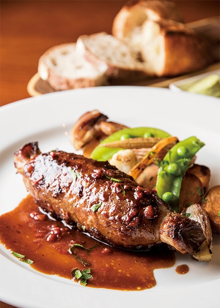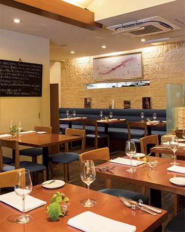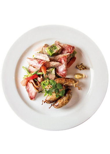 「自分で一から作れる面白さ、そして豚1頭を多彩な形で食べられる奥深さがシャルキュトリーの魅力」とは五木田シェフ。その言葉どおり、メニューにはおなじみのパテ・ド・カンパーニュから古典的なパテ・アンクルートまで、シャルキュトリーが満載! なかでも特筆すべきはアンドゥイエット(内臓のソーセージ)だ。本来はクセのある料理ながら、ビストロノミーを目指すシェフのこと、丁寧な下ごしらえに加え、シェリービネガー風味のスッキリした酸味のソースを添えることで、軽やかながらも味わい深い逸品に仕上げている。
