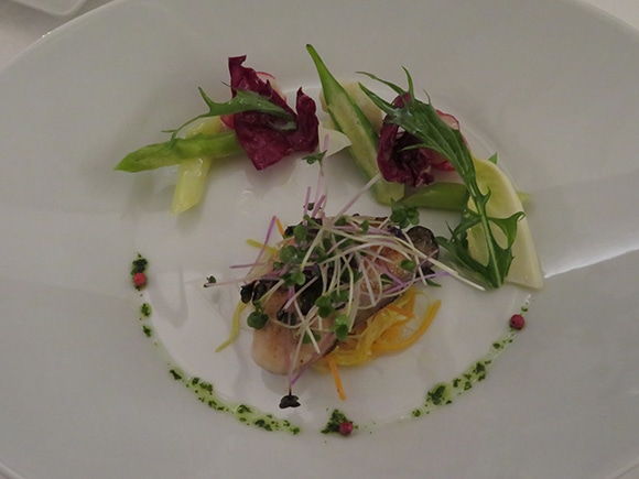 いざ夕食を食べに、細い道路を渡って向かい側のレストラン棟に行きました。料理には瀬戸内海で水揚げされる魚貝類や、近隣の豊富な食材を使い、野菜もたくさん並ぶ南フランス風の料理です。四季を通じて豊富な海の幸も、シェフが毎日仕入れに行くといいます。それを盛り上げるのは自然派のワイン。「胃にもたれない料理を心がけています」というメニューの数々に、シ・ア・ワ・セな夜が過ぎていきました。