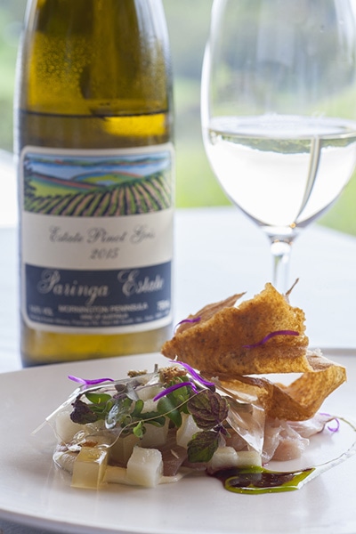 スコッチ・ウイスキーを思わせる香味のあるシャルドネやワイルドベリーが香るピノノワールとともにパリンガ・エステートの魅力に寄与しているのがワイナリーに併設されたレストランだ。シェフのジュリアン・ヒルズは「修業したレストランよりも僕に影響を与えているのはモーニントン半島の風土です」と言う。毎朝のように自宅近くの海辺を歩き、野生のハーブやエディブルフラワーを自ら採取する。禅の精神でも学んだのかと思わせるほど贅肉を削いだ彼の料理は、味に透明感があり、ここのワインと高いレベルで照らし合う。「オーストラリアでおいしい料理に出合いたければワイナリーに行け」という観光的惹句はパリンガ・エステートにおいて正しい。