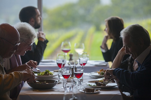シェフのスチュアート・デラーはイギリスのカリスマシェフ、マルコ・ピエール・ホワイトの薫陶を受けた料理人。ビクトリア州南部の食材の豊かさを彩りに溢れる皿で表現するスチュアートの料理が端正な造りのワインとともに旅人の高揚感に拍車をかける。