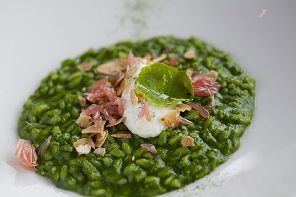 イラクサのリゾットにアーモンドとバッファローのヨーグルトを載せて。