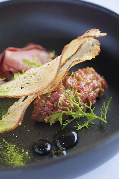 タスマニアのケープグリム・ビーフのタルタルと牛タンのピクルス漬け。スモークしたアイオリ・ソースを添えて。