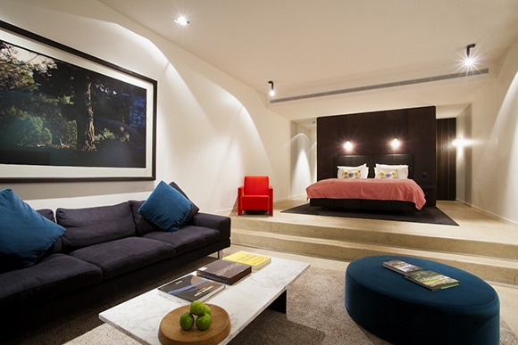 スイートルーム内観。この写真の背後はガラス張りで、その向こうは芝生からブドウ畑へとつながっている。