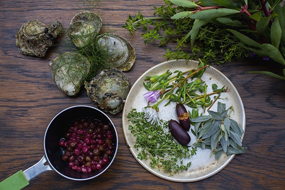 ブッシュタッカーいろいろ。花の付いた植物は塩味があって食感もユニークなピッグフェイス。赤いベリーは甘酸っぱいライベリー。牡蠣はネイティブのアンガシ・オイスター。