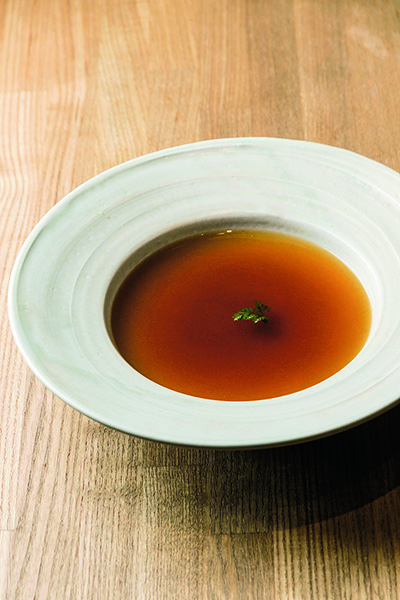 左:丸々1本使う牛スネ肉や牛骨などを煮込んでブイヨンを取り、手挽きの牛肉を加えて赤身のエキスを抽出した「ビーフコンソメ」¥2,160