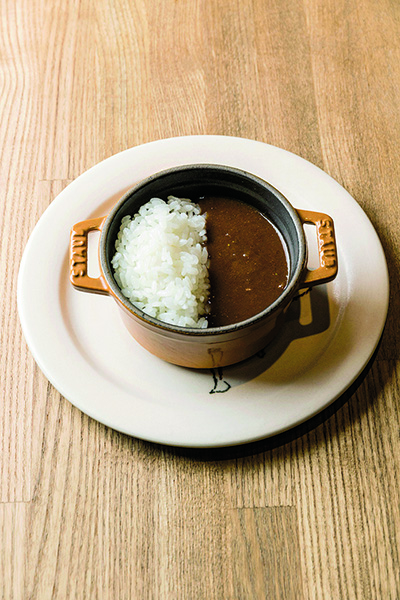 右:締めに人気の「カレー」¥1,620。アメ色に炒めたタマネギだけを具材とし、山椒を利かせた欧風カレー。