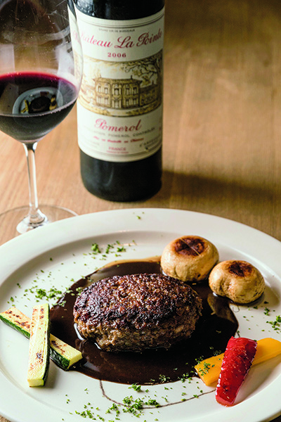 好みのグラム数で作ってもらえる「ハンバーグ」。写真は200g¥5,400。マデラソースを添えて。グラスワインを合わせるなら、おすすめは「シャトー ラ・ポワント」グラス¥2,700