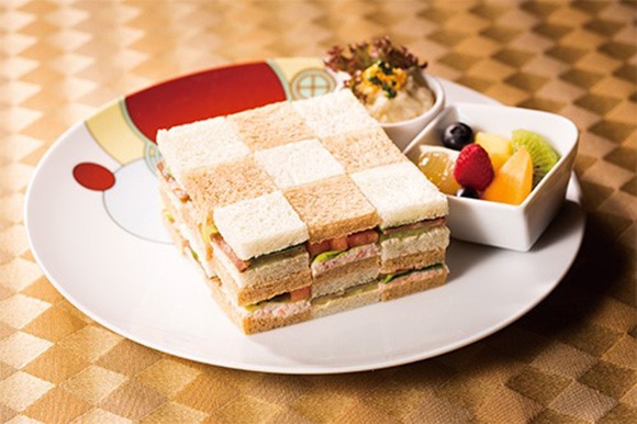 ライトが好み、ライト館でもさまざまなデザインのモチーフとなった市松模様をサンドイッチで表現。コールドローストビーフやカニを挟んだサンドイッチを、ライトがデザインしたプレートに盛りつけて。本館中2F「オールドインペリアルバー」で提供中。「ライトサンドイッチ」¥2,380 *消費税込み、サービス料別。