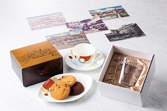 種類豊富な記念グッズは、ホテルショップ「ガルガンチュワ」にて販売中。奥:帝国ホテルに伝わるライト館のイラストや写真の絵葉書(5枚入り)¥648 右前:「オールドインペリアルバー」で使用されている、ライトが好んだ市松モチーフをあしらった「オールドファッションドグラス」¥3,240 左前:ライト館のイラストをあしらったパッケージのクッキー詰め合わせ(チョコレートチップ、ココア各4枚入り)¥1,080