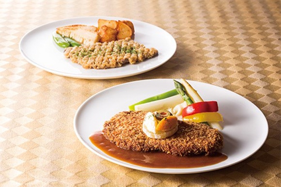 ホテルショップ「ガルガンチュワ」にて、すでに好評の「シャリアピンステーキ」に加え、ライト館時代にレストランで提供していたメニューを惣菜として提供中。奥:ライト館時代のレストラン「ニューグリル」で誕生した、歴史ある「シャリアピンステーキ」¥4,320 手前:「ニューグリル」のメニューを再現した、6月30日(金)まで提供中の「仔牛のカツレツ リエージュ風」¥3,240