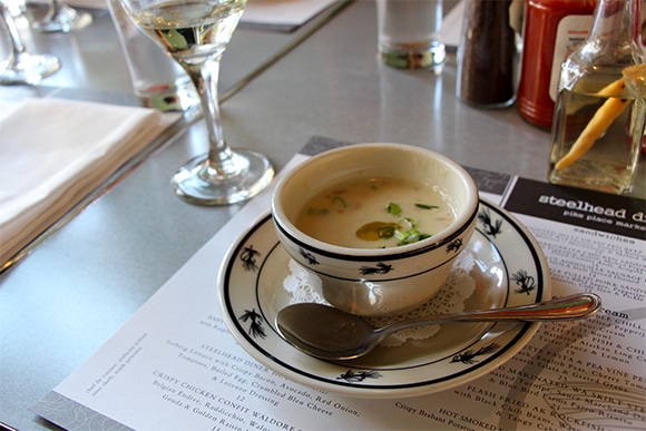 セイバー・シアトル・フードツアーで訪れたスティールヘッド・ダイナーで名物のクラムチャウダーをいただく。こちらはツアーで出されるテイスティングサイズ。