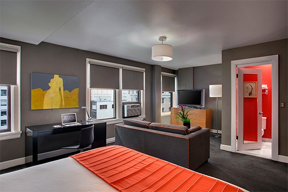 そんなシアトルに滞在するなら、やはりロック・スピリッツを感じさせるブティックホテルを選びたいもの。この街を訪れるミュージシャンやアーティストの定宿が、パイクプレイスマーケットにほど近いホテル・マックスだ。1階のラウンジにはアンディ・ウォーホルの作品やニルヴァーナが使っていたベースが飾られているほか、館内の各フロアはそれぞれ異なるローカルのフォトグラファーやペインターたちの作品が展示されており、アーティスティックな雰囲気に。また5階にある19室はシアトルを代表するインディーズ・レーベル、サブ・ポップ・レコードとコラボレート。全ての客室にレコードプレーヤーと、サブ・ポップがキュレートしたレコードが用意されている。