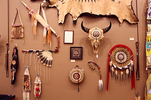 お土産を探すなら、ネイティブアメリカンの作家によるアートやクラフトが揃うプレイリー・エッジ・トレーディング・カンパニー&ギャラリーへ。バッファローのスカルやディアスキンを使ったタペストリー、1点もののインディアンジュエリー、ハンドメイドのビーズを用いた作品にはそれぞれの作家のプロフィールが記されている。ペンドルトンのラグやネイティブアメリカンスターキルトなど、ファブリック類も充実している。